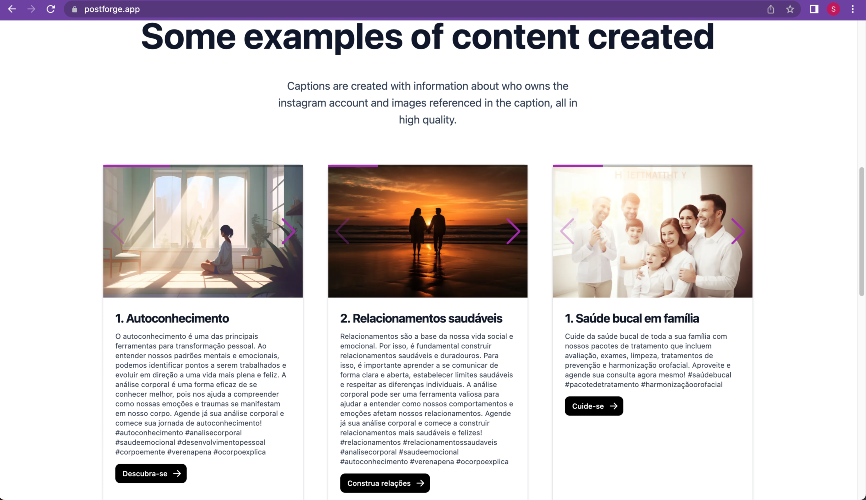 Looking for an easy way to create amazing content for your social media channels? Look no further than Post Forge - the powerful AI tool that makes content creation a breeze. With just two simple steps, you can unlock a wealth of new content for your Instagram account. Simply enter little bit about you and if you have instagram select three posts that describe the content you want to create. Within seconds, Post Forge will generate five brand new pieces of content that you can use to engage your followers and build your brand. So why waste hours creating content from scratch, when you can let Post Forge do the heavy lifting for you? Try it out today and see for yourself just how easy it can be to create incredible content that gets noticed!