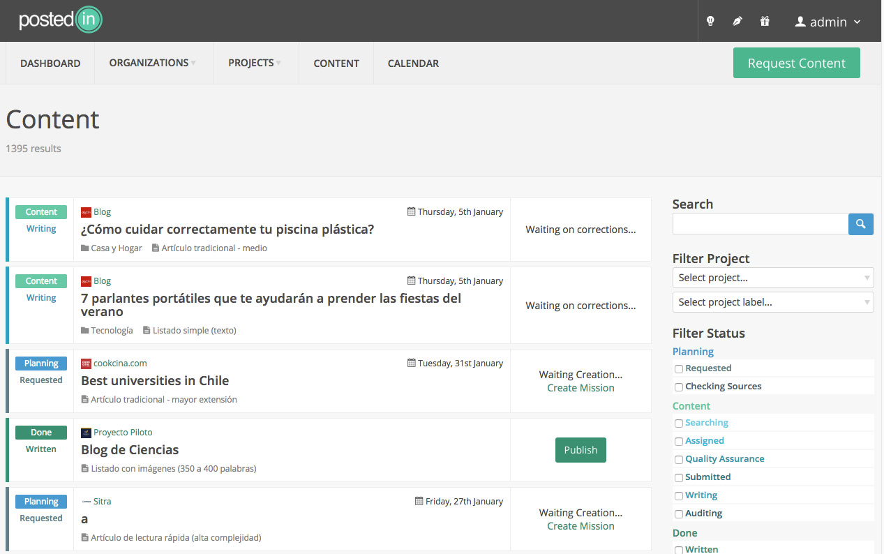Postedin is a dynamic content marketplace that connects brands with high quality content-creators. Clients can request content on-demand from specialists, who are curated, ranked and automatically selected through reputation and skills. The Postedin Team controls quality by reviewing all content before it is delivered. Our creative learning process creates relationships between content, client ratings, comments and the people who get involved in the project. This means that the ongoing development quality increases. Whether its 500 or 5.000 content pieces, our scalable content platform works!