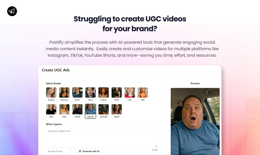 Turn ideas into viral UGC videos Grow your brand with AI-generated captions and UGC videos—effortlessly Postiffy is the fastest way to create UGC videos with AI avatars, viral captions, and your product demos—perfect for TikTok, Instagram, and YouTube Shorts. No editing skills are needed.
