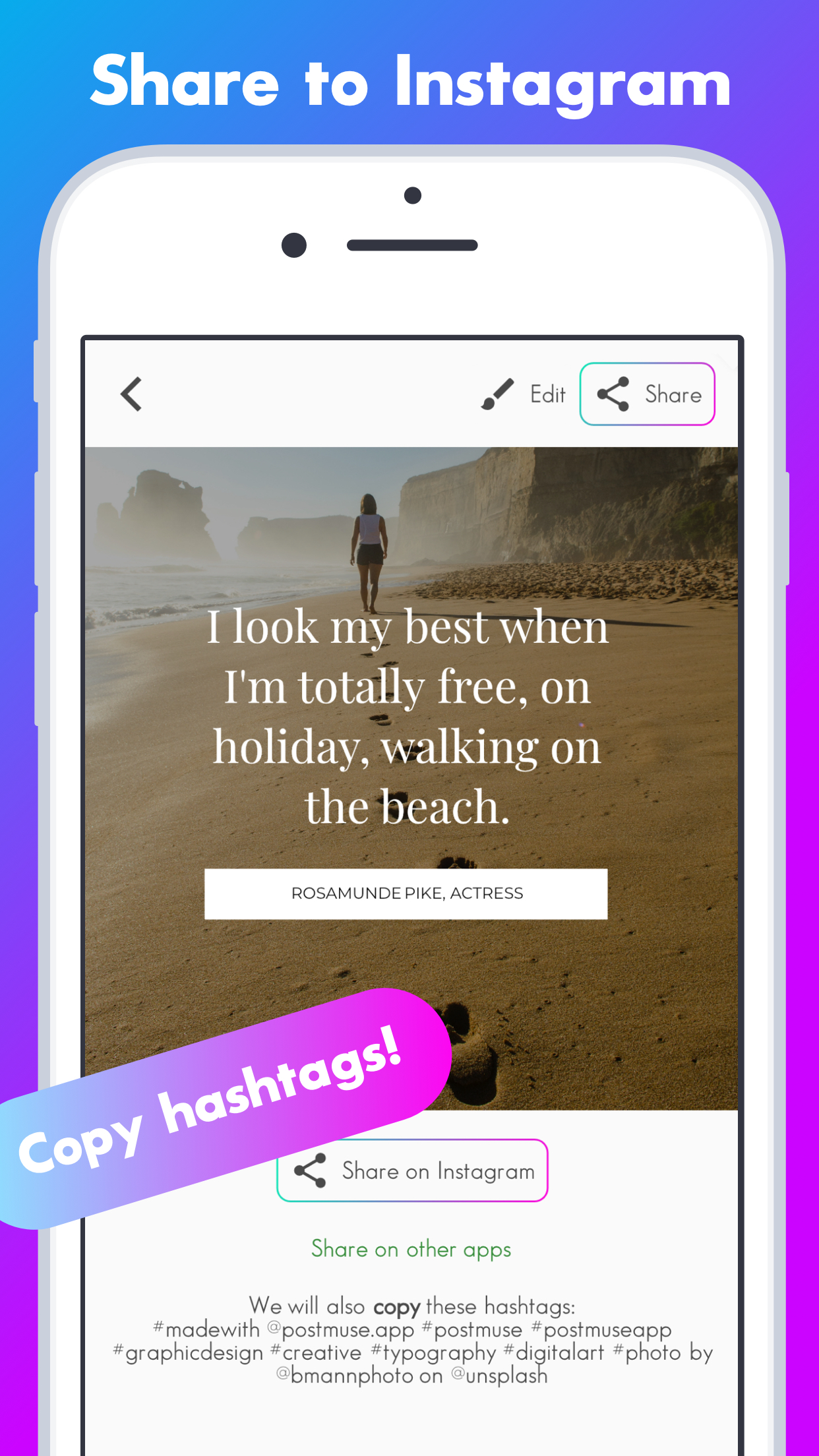 PostMuse helps you post professional-looking posts to Instagram more often. Find your inspiration by browsing through templates, edit them and make them your own. There are plenty of fonts to choose from, images backed by Unsplash and emojis. We also do our best to suggest colors to use, starting from your image. Be gentle, this is our beginning ?