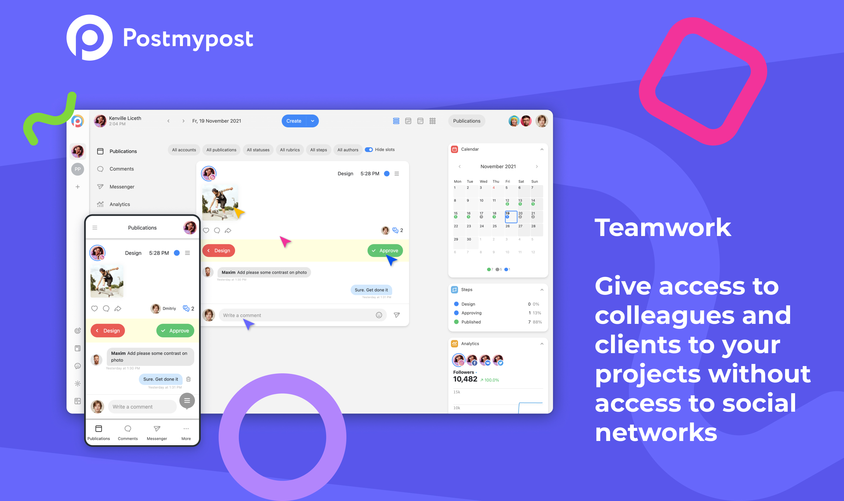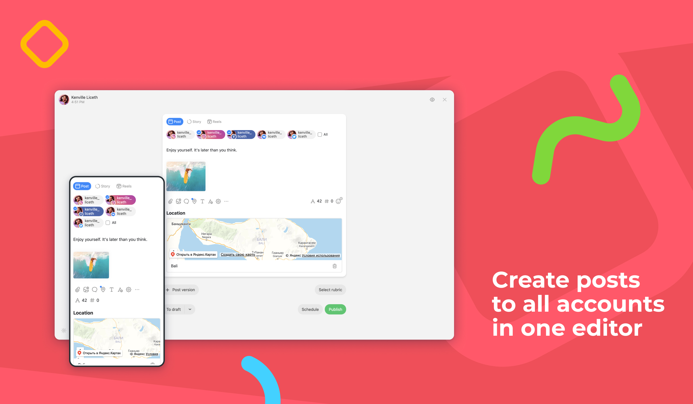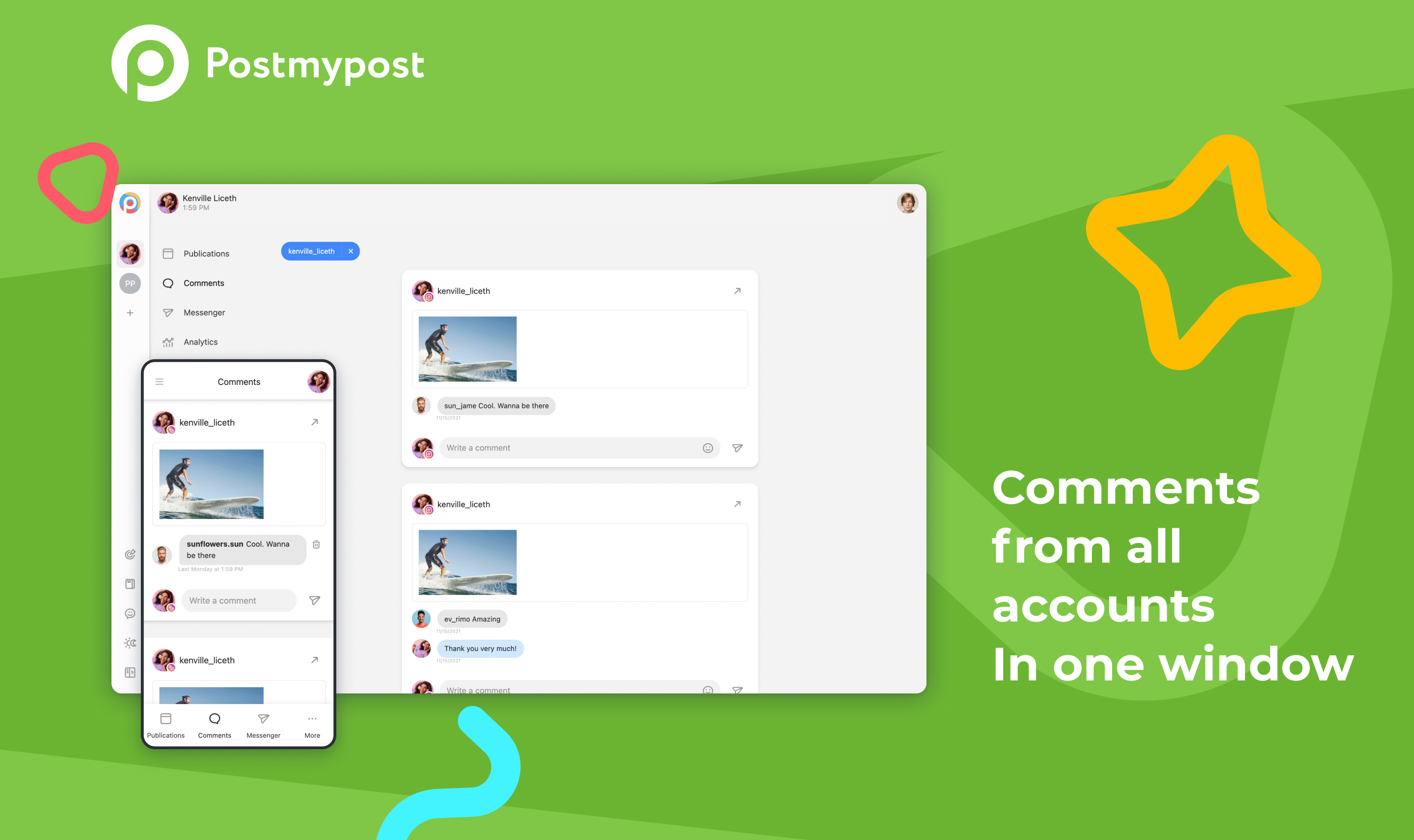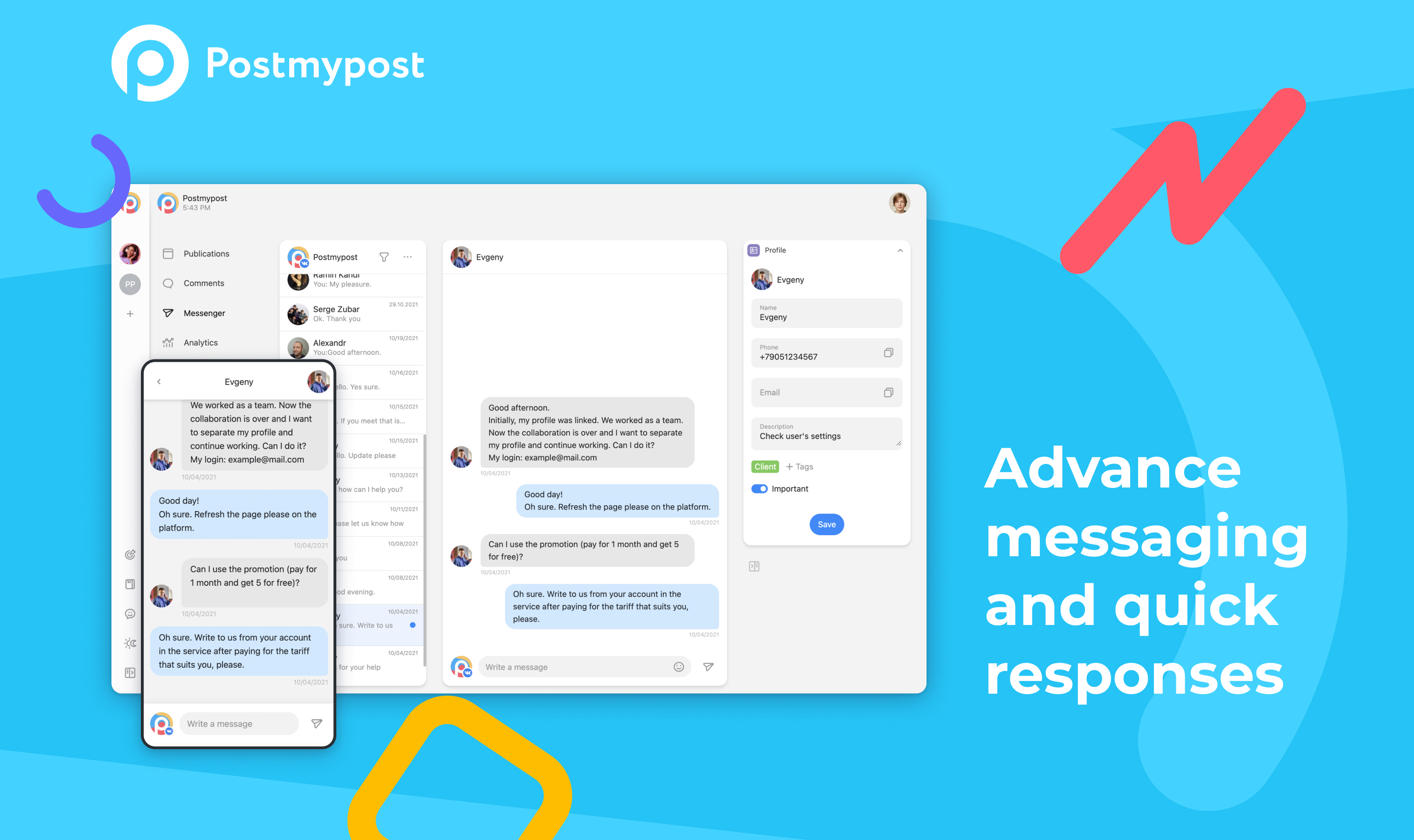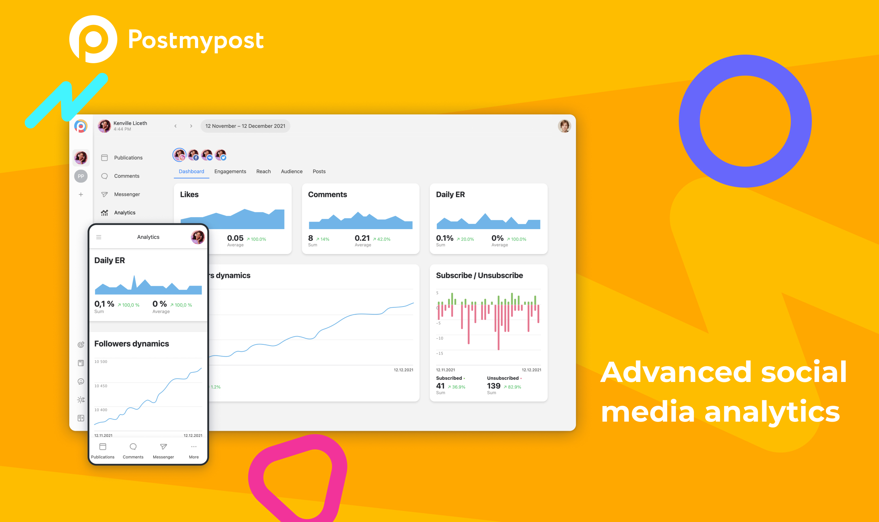Publish, schedule and make visual feed. Social media analytics – posts, engagement, audience. Comment tracking and messaging with CRM functions – Instagram Direct, Facebook. Telegram and email notifications for comments and messages.