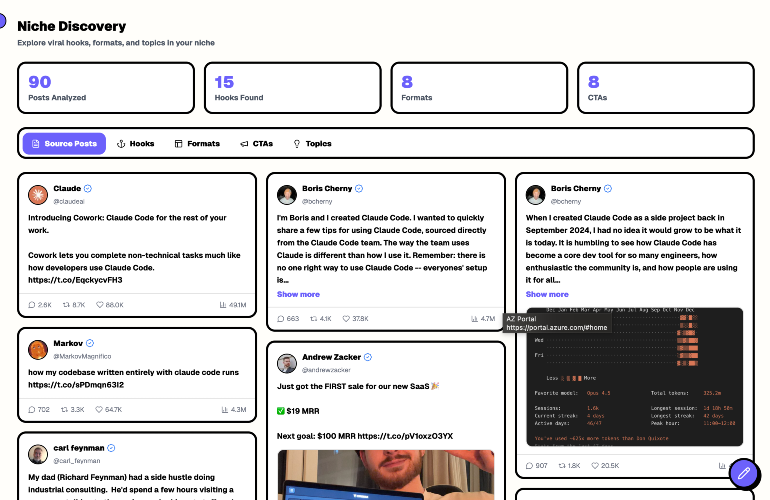 PostPulse discovers topics, formats, CTAs, and hooks from highly engaging posts in your niche and uses these formats to generate posts that sound like you wrote them PostPulse is not a growth tool. It just helps you save time and effort writing and looking for ideas to write about. Within a few seconds, you'll have ready posts that you can publish to X/Twitter, Threads, BlueSky, and LinkedIn Generated posts can be repurposed for LinkedIn's desired long format