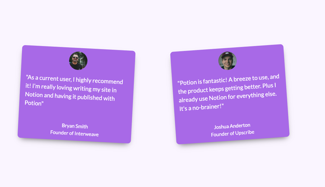 Create custom websites in minutes. All on Notion. Potion adds the magic, generating a speedy site with custom domains, styles and great SEO. Notion is an Amazing CMS. You're already writing all your content there. Why not use it for your website? Potion makes this possible. Custom Domains Turn your pages into a publicly-accessible website that’s truly yours. Custom Styles You can add your own css and fonts with snippet injection and change the default Notion-like styles. Great SEO Potion is optimized so that search engines find your website. Super Fast Page Speeds Potion generates a static site so navigating between pages and loading them is like the snap of a finger. Update and it's live All content changes and edits appear on your site instantly. Automatically Generated SEO-friendly URLs Potion generates SEO-friendly URLs from your child page titles. Potion is great for these kinds of sites - Help Docs - Portfolio - Landing pages - Blog - Career Pages - Info Products