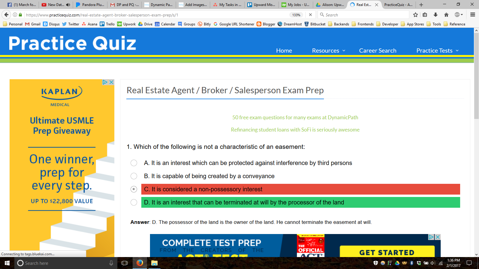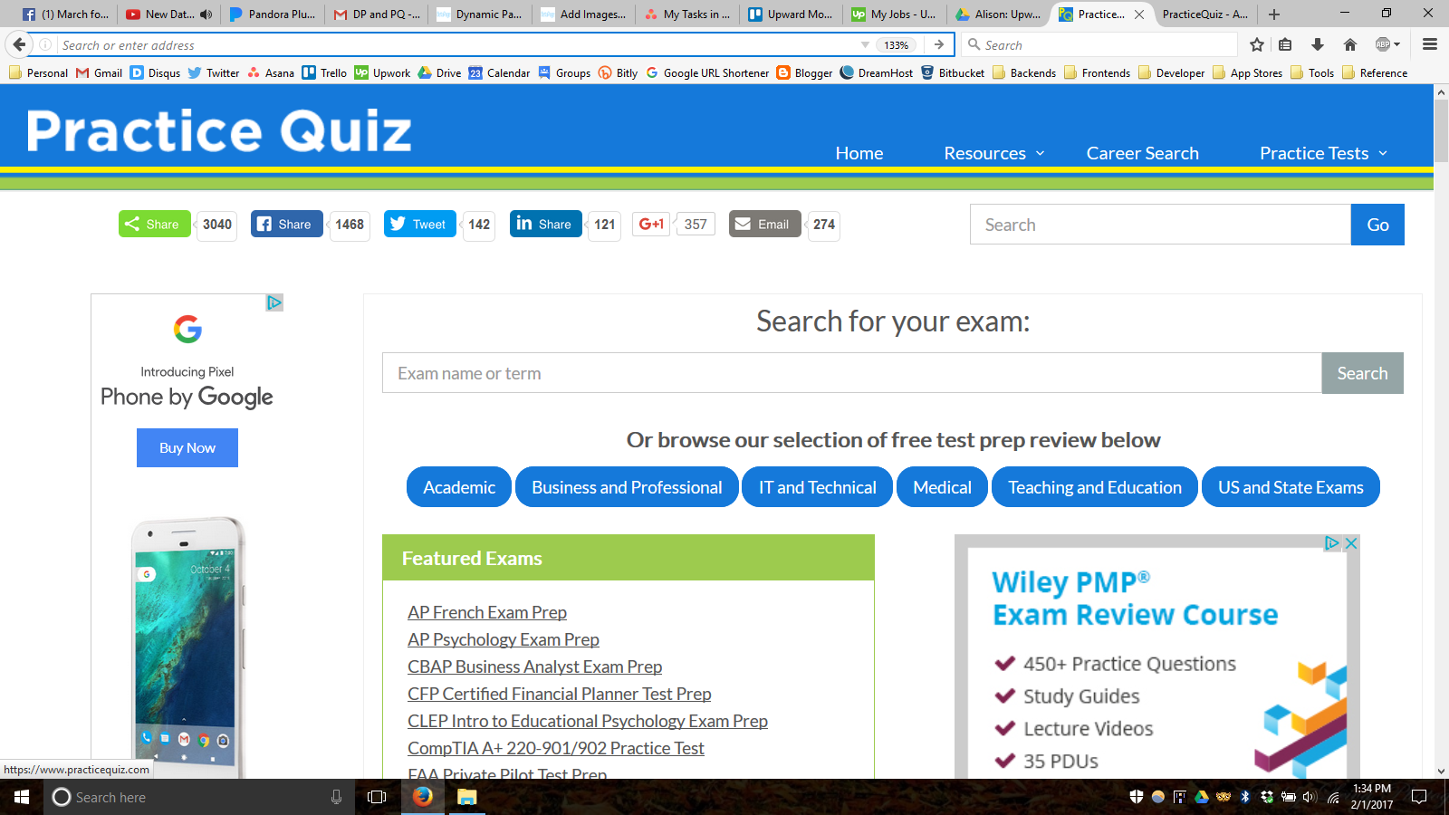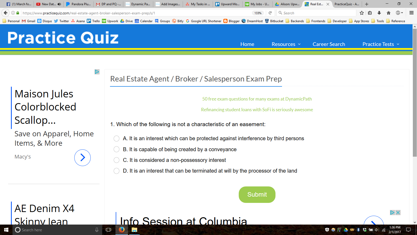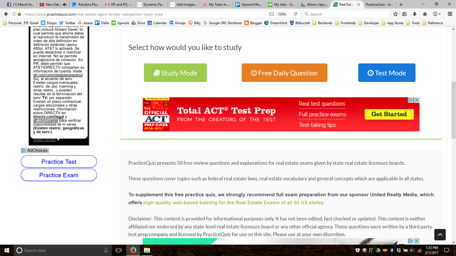 Practice Quiz provides free study questions for over 300 academic and professional exams. We offer modules for both national and state-level academic tests, and licensing exams for business, finance, IT, healthcare, social services, teaching, and more. Users can review questions one-by-one in study mode, or take a timed quiz with customizable length and subject parameters. Practice Quiz is a double bottom line company based in Boston, MA.