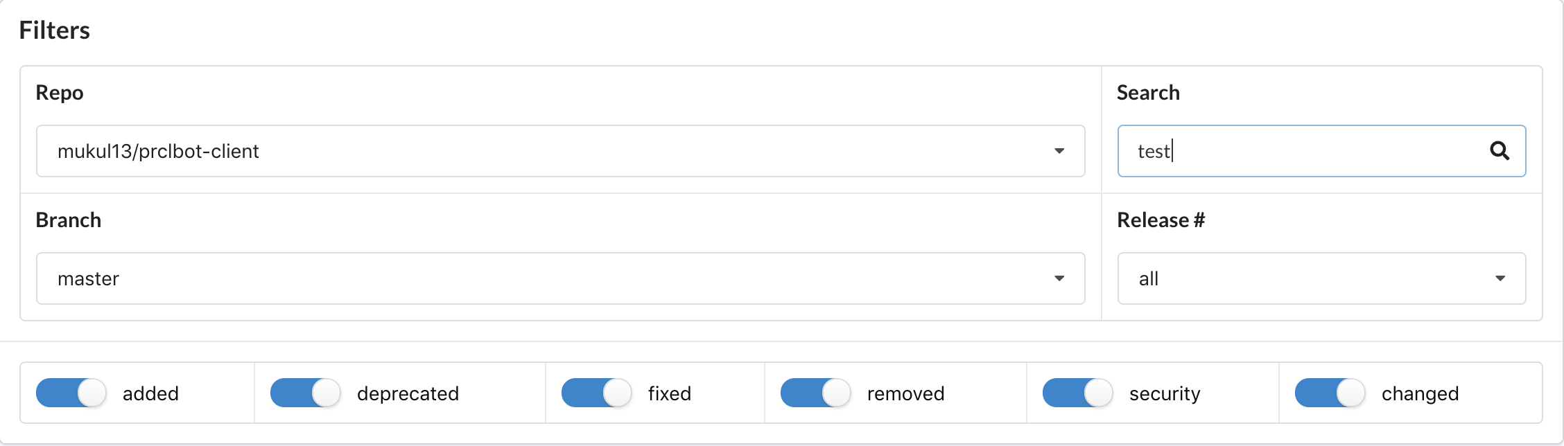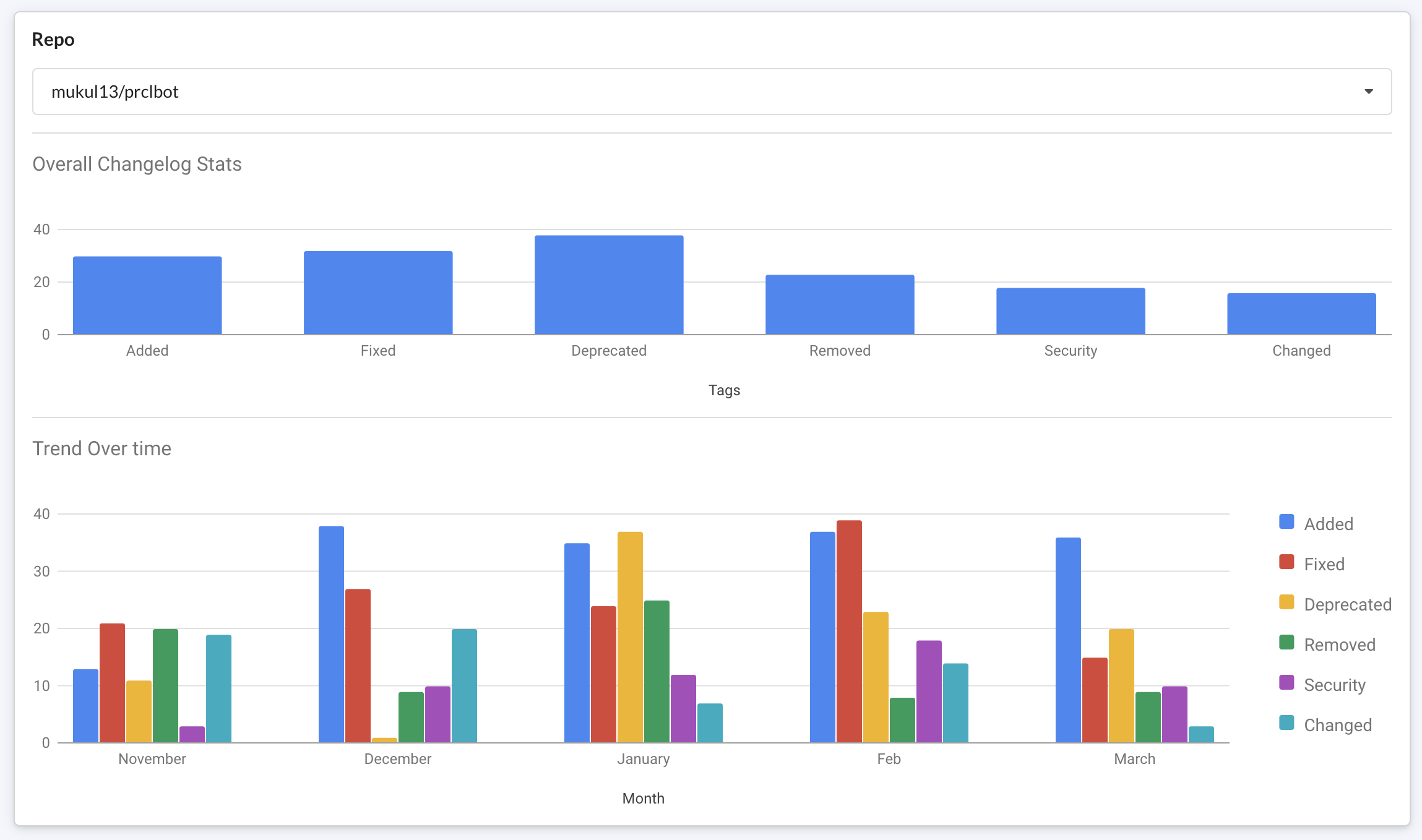 Problem When multiple people are working on a repo in Github, the chance that they are aware of all changes becomes slimmer. With time, changelog files get bigger and they might get less human-readable and less-searchable. The well-maintained changelog also has valuable data that can be used to debug issues effectively, gain insights and to keep track of the team's productivity and metrics. Solution To solve this, I got the idea of PRCLbot which is an easy-to-setup github app to automate changelog generation flow from merged pull requests, keep the team connected with new changes and help you gain insights from it. Key Features - Intuitive dashboard to keep track of changelog history, release versions, etc. - Advanced filtering options to extract the desired changelog. - Derive project insights and metrics from your changelog. - Keep different versions of changelog depending on branches (production, development, QA, Staging, etc). - Create public links for changelog which can be shared with everyone. Keep your users in the loop with the team's awesome progress. I hope you enjoy this app and get some value out of it! Feel free to check it out. I'd love to hear your thoughts/insights/feedback on it.