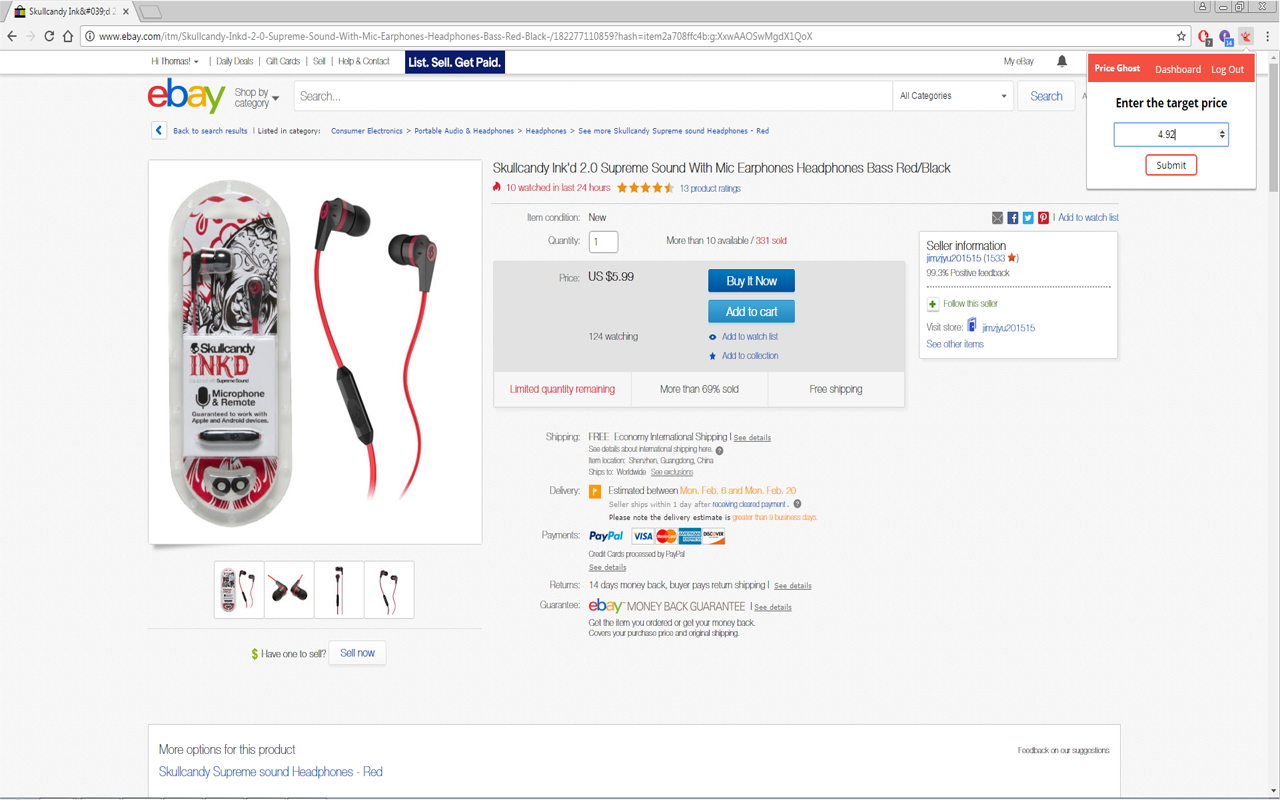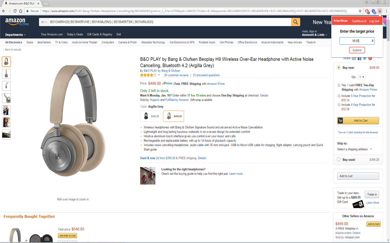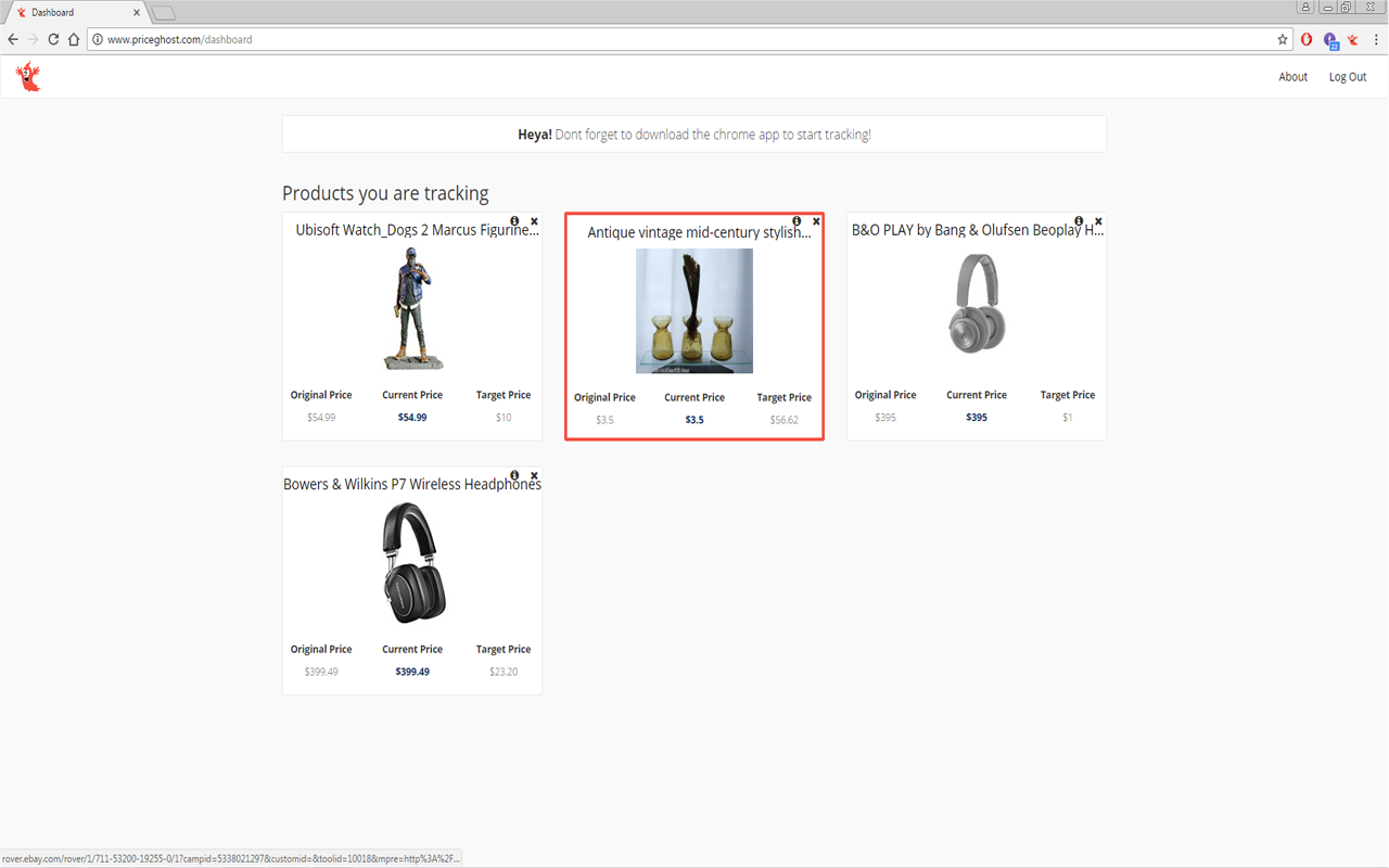 Price ghost allows for one click Amazon/Ebay/Walmart price tracking and email notifications. Set up price targets with one click and receive email notifications when they reach your target. Price ghost will track the product and you will be immediately notified once the price drops.