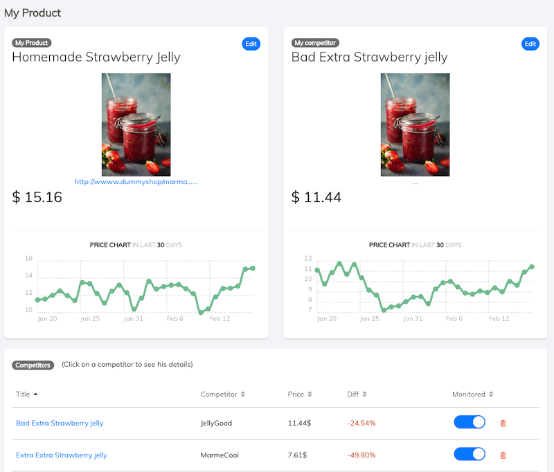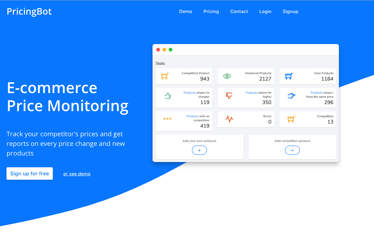 PricingBot is a competitor price monitoring software for E-commerce companies. With PricingBot you can track your competitor's prices and get reports on every price change and new products. PricingBot will help you: - Automatically track your competitors' price - Get alerts on price and stock changes - Get beautiful dashboards and summaries about your competitors' pricing and catalog updates.
