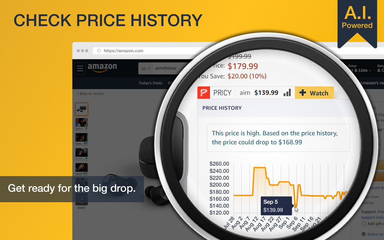 Never miss a deal again with Pricy ------------- Pricy Extension directly integrates into amazon. When you are watching a product it displayed just below the price tag. ------------- Never Overpay again ------------- Pricy will always tell you when the price of the product is high and if it’s worth waiting for a better price. Based on the price history, Pricy calculates the probable future price for a product. ------------- Check the Price History ------------- Just hover over, and Pricy will show you how the price changed in the past so you can easily find trends and get ready for the big drop. ------------- Instant Price Drop Notifications ------------- Set a price that you would pay for the product. Pricy will monitor the price of the product and send you a notification as soon as it drops below your defined price.