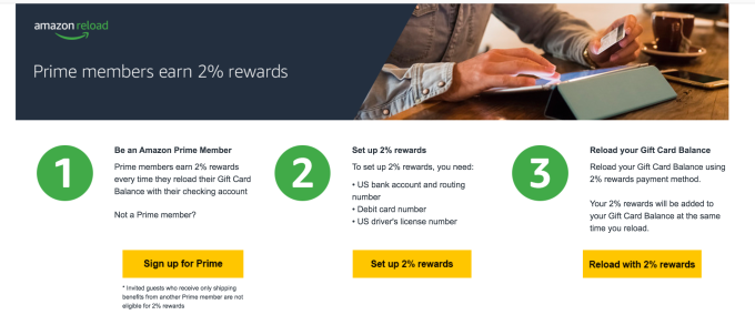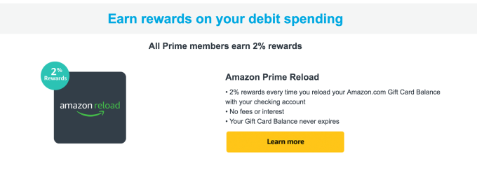Amazon today is launching a new perk for Prime members that will give them cash back on purchases – even if they’re not paying for items using an Amazon cashback credit card. Through a new rewards program called Amazon Prime Reload, Prime members can receive 2 percent back on purchases when they first load funds into their Amazon Balance using a debit card attached to their bank’s checking account. Amazon Prime Reload is meant to encourage more people to sign up for Prime, the $99 per year membership program that includes free, 2-day shipping on millions of products, plus same-day shipping in select markets, along with a host of other features like access to Amazon’s Netflix-like service Prime Video, music streaming via Prime Music, free e-books and magazines through Prime Reading, Audible Channels, unlimited photo backup and storage via Prime Photos, Twitch Prime, early access to deals and much more.