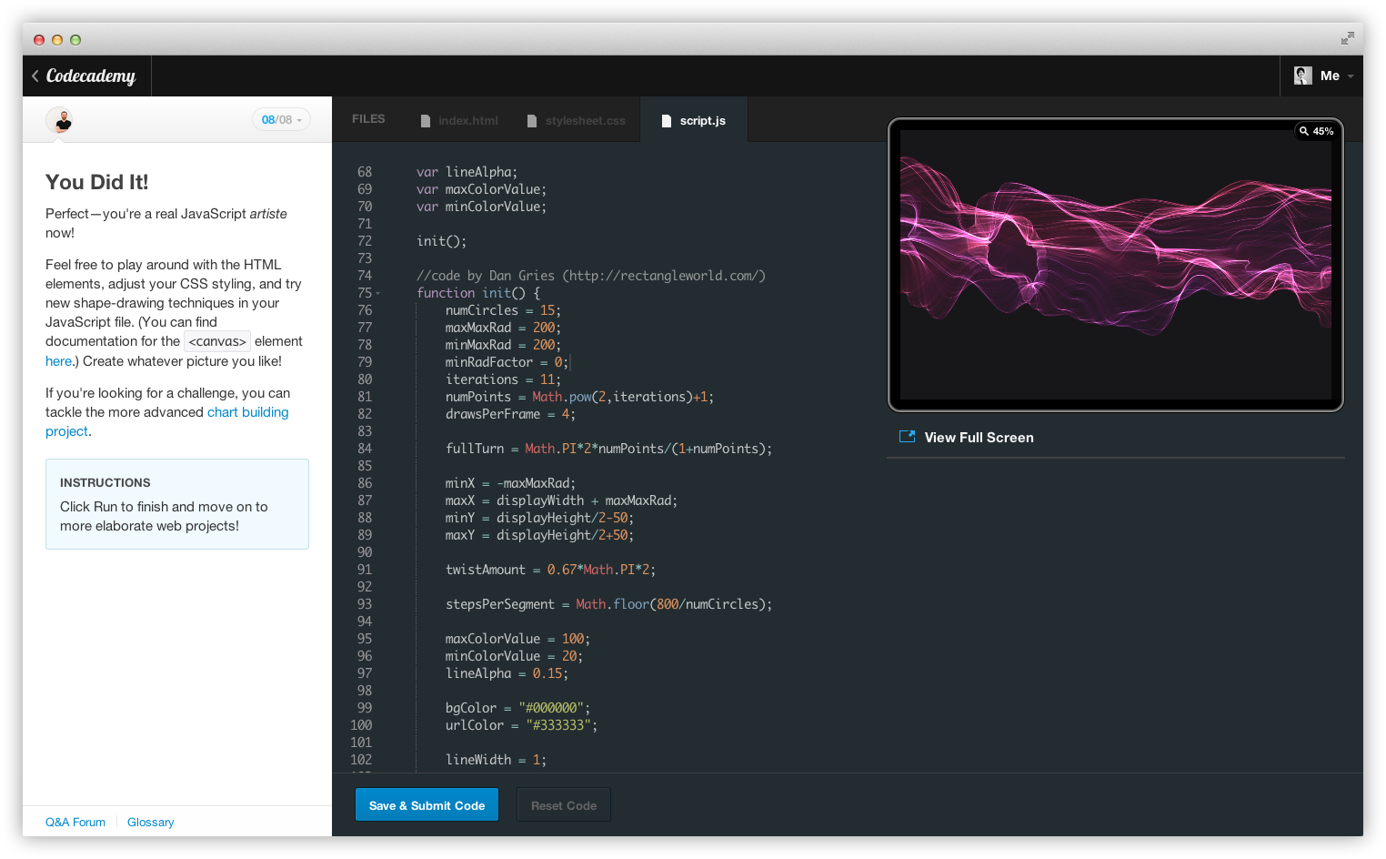 Codecademy Pro Intensive provides more structured 8-10 week programs that include real projects students are asked to build using the same tools as professional developers. Each course costs $199 and is targeted at users who wish to learn specific skills to advance their careers, like building websites from scratch or building front end apps. And for $500, users can sign up for Codecademy Pro Mentor, which includes all the same benefits and materials as Pro Intensive, but with the added bonus of 30-minute live video sessions with a mentor each week.