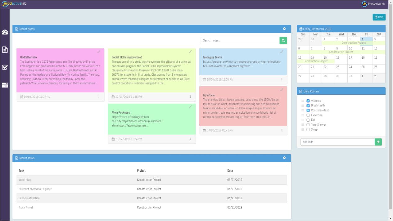 ProdActiveLab offers a straight-forward way to start being productive utilizing known tools to help bring ideas to life. From your day to day tasks, write-ups and managing your project with a team, ProdActiveLab features the necessary tools you need. - Designed to be used flexibly by individual people who likes every thing organized. - For teams / organizations that has a step-by-step processes or procedures - For people having difficulties in managing their day to day routines Unlike other productivity tools, we offer a lightweight, straight-forward way of managing your write-ups, todos, tasks and your team without the unnecessary clutter that could overwhelm you and your collaborators.