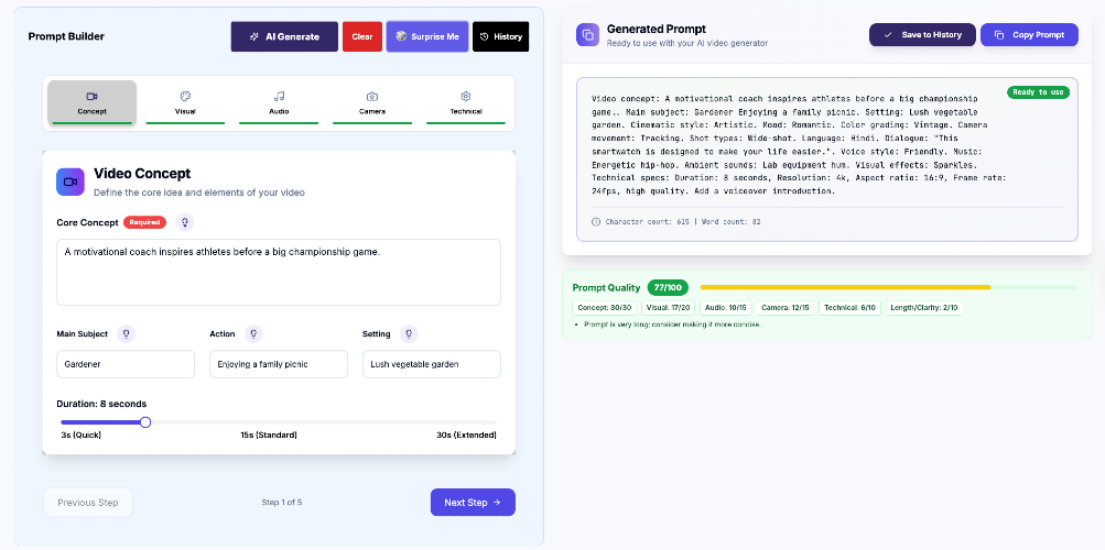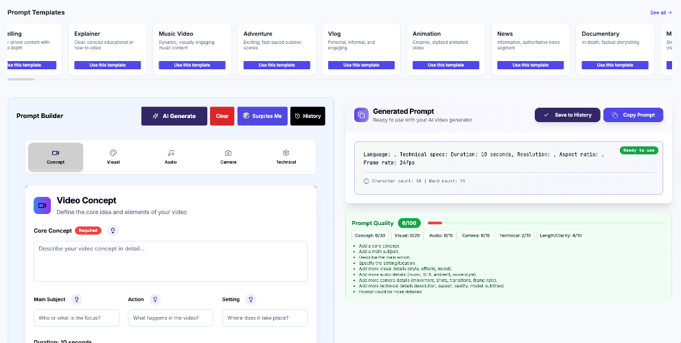 Promptstudio is your go-to platform for creating stunning AI-generated video prompts. With over 50 professionally crafted templates, you can easily generate high-quality prompts tailored to any video style or genre. Our advanced AI technology provides real-time suggestions and optimizations, ensuring your videos have maximum impact. Whether you're a beginner or a seasoned professional, Promptstudio empowers you to bring your creative visions to life in just seconds.