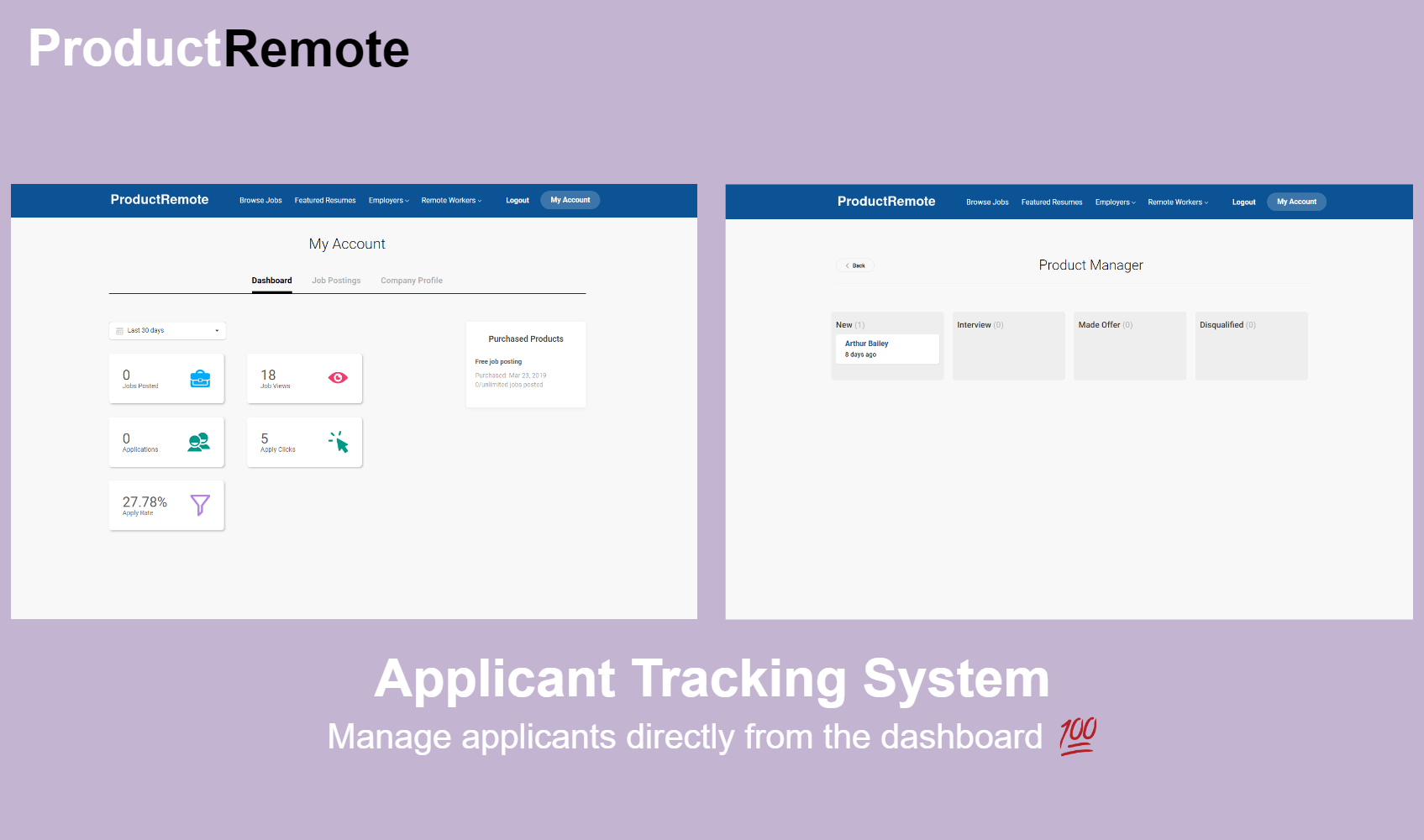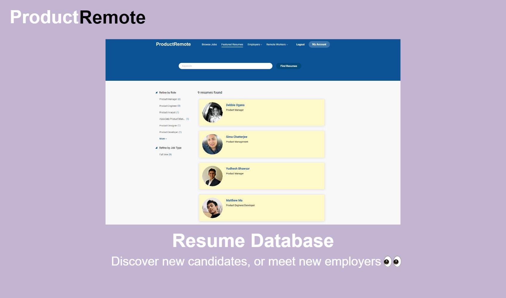 [ - ] 100% Fully Remote Product Jobs [ - ] Resume Database For Featured Job Seekers [ - ] FREE Resume Review Service (Coming Soon) [ - ] Built-in Applicant Tracking System