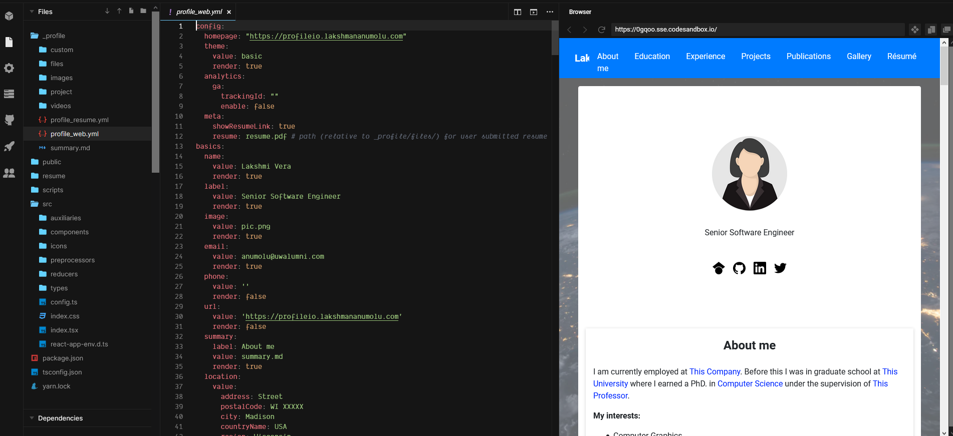 ProfileIO is designed to make deployment of website and resume generation easy for students and researchers who are not familiar with web utilities. It leverages GitHub actions and free hosting services with a goal to encourage all students to deploy and maintain their personal website.