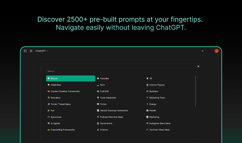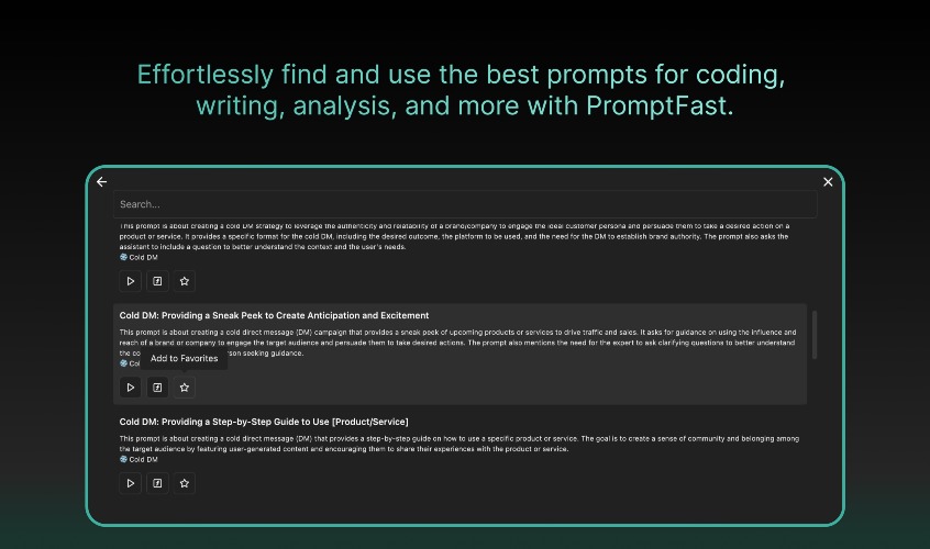 PromptFast is a revolutionary tool that seamlessly integrates with ChatGPT, providing users with instant access to a vast library of over 2,500 carefully curated prompts spanning diverse topics and use cases. With PromptFast, you can unlock the true potential of ChatGPT, boosting your productivity by effortlessly finding the perfect prompts for any occasion, all conveniently available within your ChatGPT interface.
