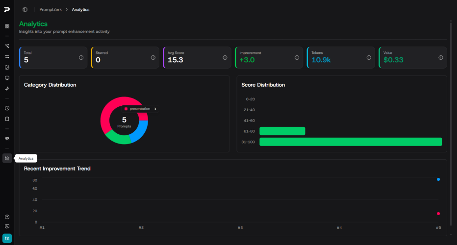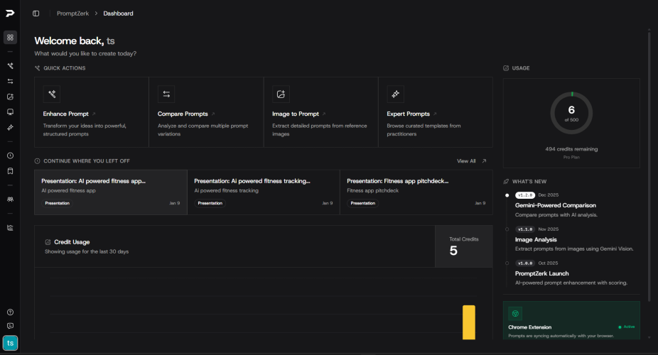 PromptZerk: Professional Prompt Engineering Made Simple Stop wasting time rewriting prompts. PromptZerk transforms basic AI prompts into expert-level instructions that deliver better results on the first try. Core Features: AI-Powered Enhancement Automatically optimize your prompts using multi-strategy algorithms trained on expert datasets. Get instant improvements with clear explanations of what changed and why. Real-Time Scoring & Analytics Every prompt gets scored 0-100 on clarity, specificity, structure, and effectiveness. See exactly what works and track your improvement over time. A/B Testing System Generate 4 optimized variants (conservative, moderate, aggressive, specialized) with side-by-side comparison metrics. Find the perfect prompt for your use case. Smart Templates Build reusable prompt templates with dynamic variables for consistent results across projects. Perfect for repetitive workflows. Image-to-Prompt (Expert) Upload screenshots or mockups and get optimized prompts automatically generated from visual context. Presentation Builder (Pro+) Generate comprehensive slide deck prompts with customizable structure, tone, and visual style. How It Works: Paste your prompt or start from a template Get instant scoring and AI-powered enhancement Compare multiple variants side-by-side Save, organize, and version your best prompts Deploy anywhere (ChatGPT, Claude, Gemini, or any AI platform) Why Choose PromptZerk: Unlike rigid prompt generators, we let you edit everything. Organize prompts in collections, track version history with rollback, and learn from detailed analytics. Built on proven NLP techniques with continuous improvement from real-world usage. Pricing: • Basic (Free): 10 credits/week, core enhancement features • Pro ($10/mo or $100/yr): 500 credits/month, A/B testing, compare tools, analytics • Expert ($20/mo or $200/yr): 1000 credits/month, image-to-prompt, expert library, priority support Perfect for content creators, marketers, developers, researchers, and anyone who uses AI tools daily.