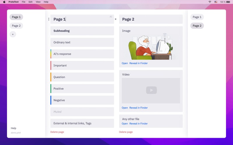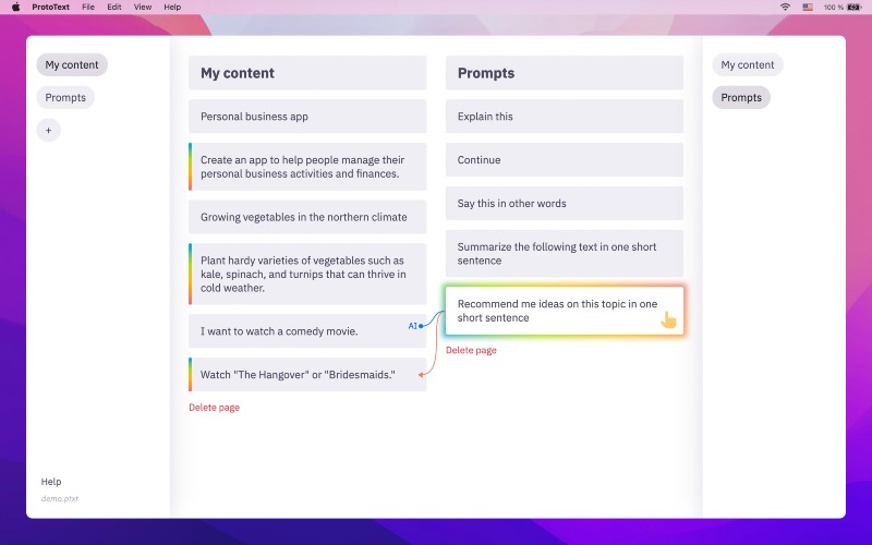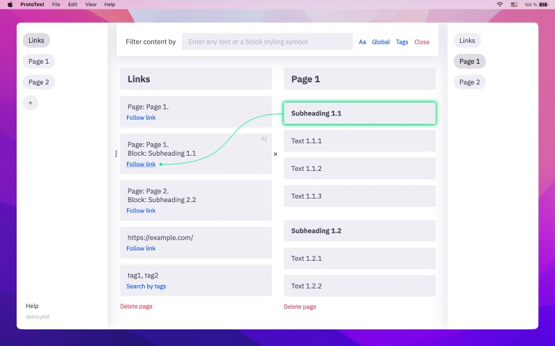 Write down your raw thoughts as small content blocks to find a structure and set priorities. Connect blocks, pages, and documents into an information network. Filter content by text or tags. Interact with ChatGPT non-linearly. Mix your content & tasks. Translate content into any languages without losing connection with the original text blocks. Present content blocks as full-screen slides. Export data keeping semantic formatting. Create secret encrypted documents.