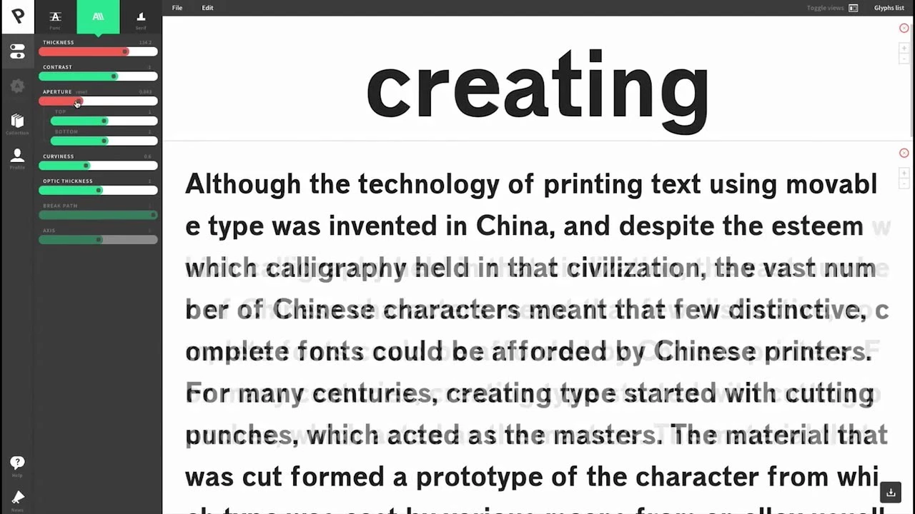 The web application Prototypo gives the ability to create custom fonts and export them to use everywhere (desktop applications, websites…). Created in May 2013 in Lyon — France, Prototypo gathers a team of experts in type, graphic design and code. Its unique font creation service is used by more than 35K designers coming from over 130 countries. Based on the parametric fonts technology that uses algorithms to generate letters, Prototypo automates the repetitive tasks specific to type design. Beyond its primarily “web-app use”, Prototypo’s engine has an infinite range of applications. Think shop windows that react according to the movements of passers-by, data visualisation that mixes info and text or websites with readability and accessibility enhanced for visually impaired people. Creating intelligent fonts capable of fitting all types of uses and media is now a reality. More info on Prototypo’s website: www.prototypo.io