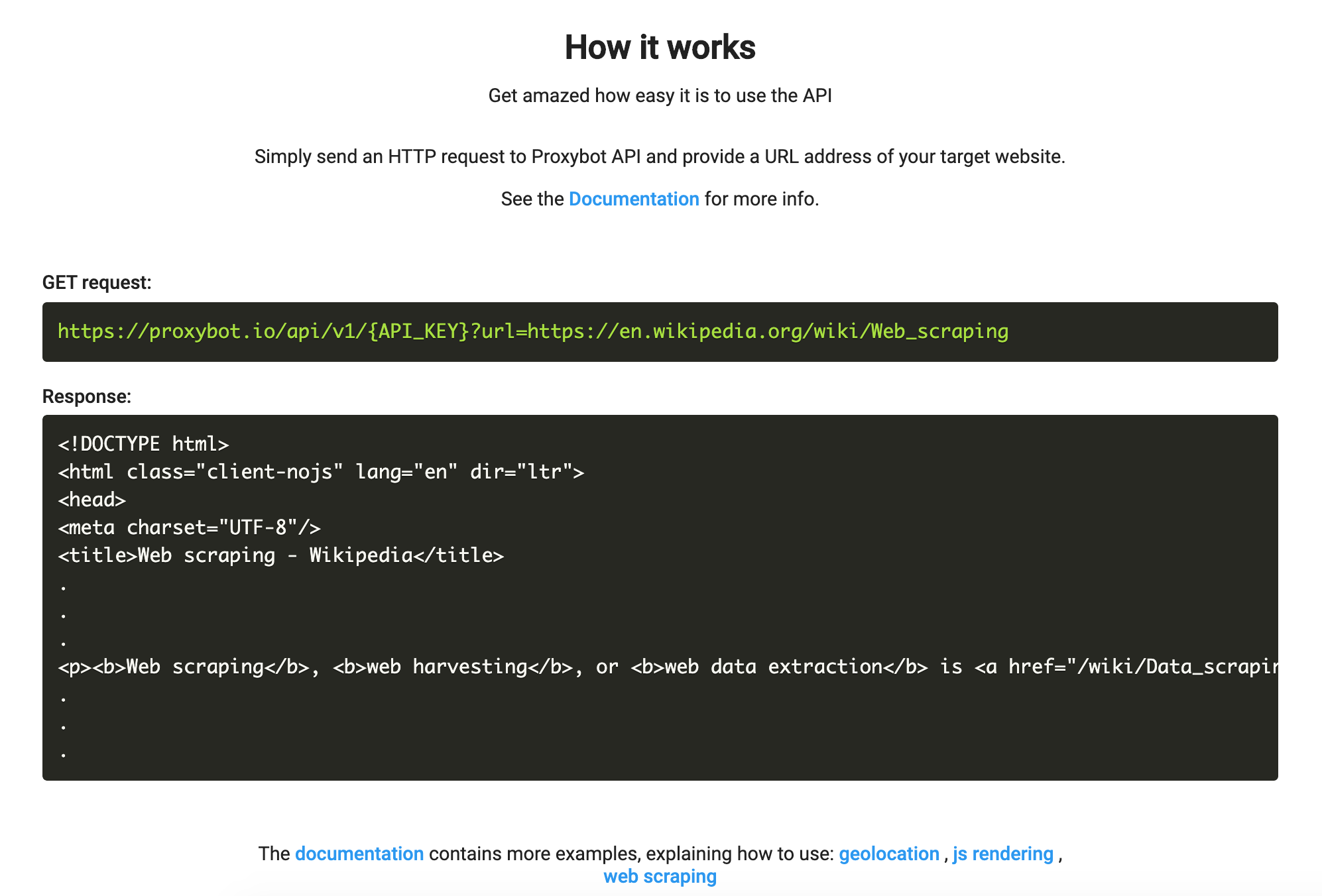 Proxybot is a Powerful Rotating proxy API service for Web Scraping With the Proxybot you don't need to spend time on boring stuff like proxy management. Focus on writing web scrapers and we will do the rest. Rotating Residential Proxy, Proxy with Geolocation, Scraping pages built with Javascript, Web Scraping with no coding and other services were created to simplify your web scraping work. https://proxybot.io/
