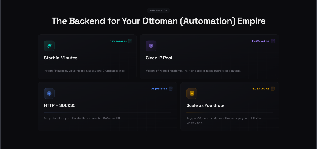 Proxyon provides residential, datacenter, and IPv6 proxies for web scraping and automation. Access millions of clean IPs across 150+ locations with city-level geographic targeting. Pay-as-you-go pricing starts at $1.75/GB with no monthly subscriptions or contracts. Features include 99.9% uptime, 1Gbps+ datacenter speeds, HTTP and SOCKS5 support, and instant setup. Developers can generate proxies via API, while standard users receive proxy URLs in the dashboard. Cryptocurrency payments accepted with no identity verification required. Built for price monitoring, web scraping, ad verification, SEO tracking, and social media management.