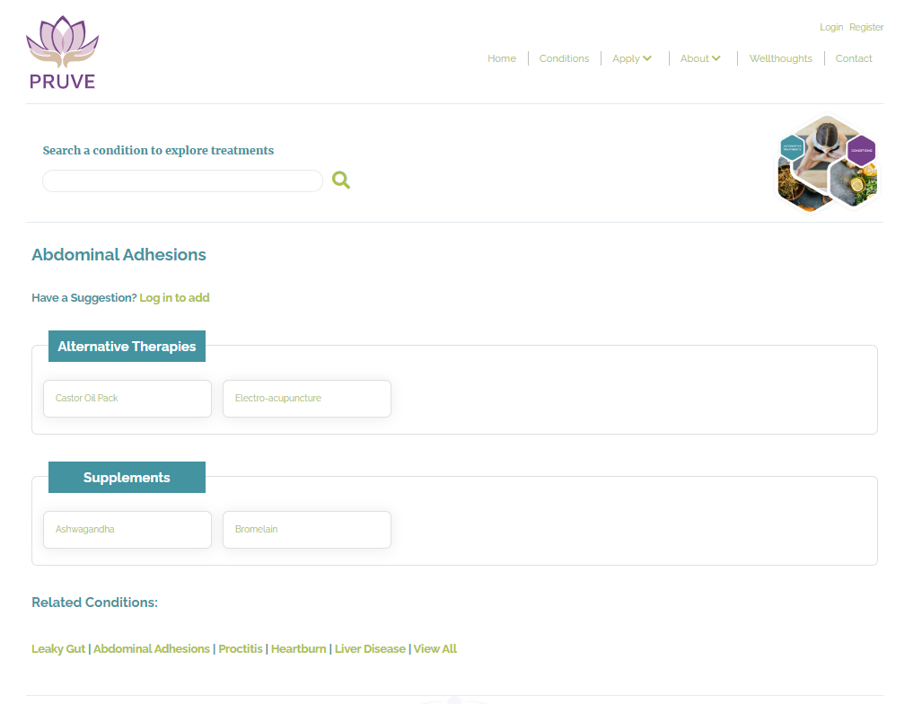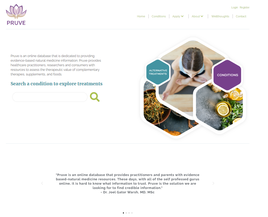 Pruve is an online resource providing convenient access to research and reviews regarding the therapeutic value of complementary therapies for the prevention and treatment of disease. Search a condition, and find the corresponding complementary therapies, supplements, and foods that have been proven to help. Founders' Story Pruve was born out of a shared frustration with our current healthcare system, and the desire to help educate people about more integrative approaches to address illness. Founders Andrew Piispanen and Jacqueline Genova created Pruve upon the belief that education equals empowerment. Pruve is an online resource where users can access evidence-based data regarding natural treatment modalities for specific illnesses, without the complexity of searching through multiple sources online. The founders’ mission is for Pruve to serve as a catalyst in shifting the healthcare system from one that focuses on suppressing symptoms to one that addresses the root-cause of illness.