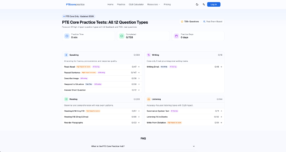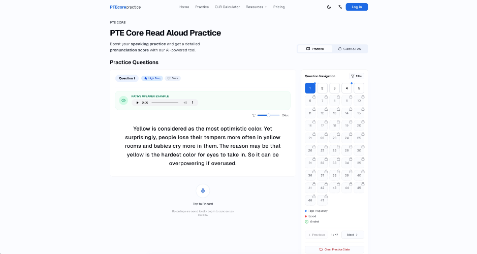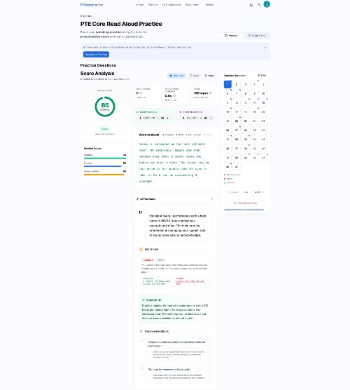 **Product Name:** PTE Core Practice Tool **Overview:** A professional, web-based platform tailored specifically for PTE (Pearson Test of English) Core Read Aloud practice, featuring real-time, AI-driven pronunciation assessment. **Key Features:** * **Curated Question Bank:** Includes 47 high-frequency, authentic PTE Core Read Aloud test items for highly targeted preparation. * **Instant In-Browser Recording:** Practice seamlessly directly in your desktop or mobile browser with zero additional software installation required. * **Native AI Scoring Engine:** Powered by the industry-leading Speechace Education Assessment API, delivering accurate, standard PTE Core scoring (ranging from 0 to 90). * **Multi-Dimensional Assessment:** * **Content (0-90):** Evaluates content completeness and the proportion of accurately spoken words. * **Pronunciation (0-90):** Provides granular, actionable feedback down to the word, syllable, and phoneme levels. * **Fluency (0-90):** Analyzes speaking rate, hesitation, pauses, and overall speech clarity. * **Granular Visual Feedback:** Dynamically highlights reading errors to help users precisely pinpoint specific areas for improvement. * **Secure Access & Cloud Sync:** Features robust authentication via Google and GitHub (powered by Supabase). All practice history and scores are automatically saved and synced across all user devices. * **Modern UI/UX:** Fully responsive design that works flawlessly across all platforms, complete with an eye-friendly layout and Dark Mode support. **Tech Stack:** * **Frontend:** Next.js 16 (App Router), React 19, TypeScript, Tailwind CSS, Shadcn UI. * **Backend & Database:** Next.js API Routes, Supabase (Auth & PostgreSQL). * **AI Evaluation:** Speechace API. * **Deployment:** Vercel.
