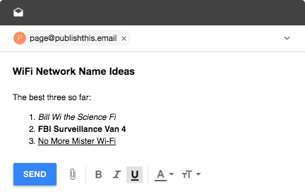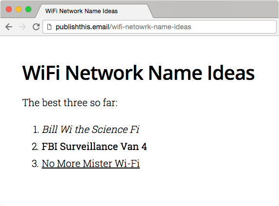 The quickest way to create a web page. No account or sign up needed. Send an email with your content to [email protected], and we'll reply instantly with a link to your new web page.
