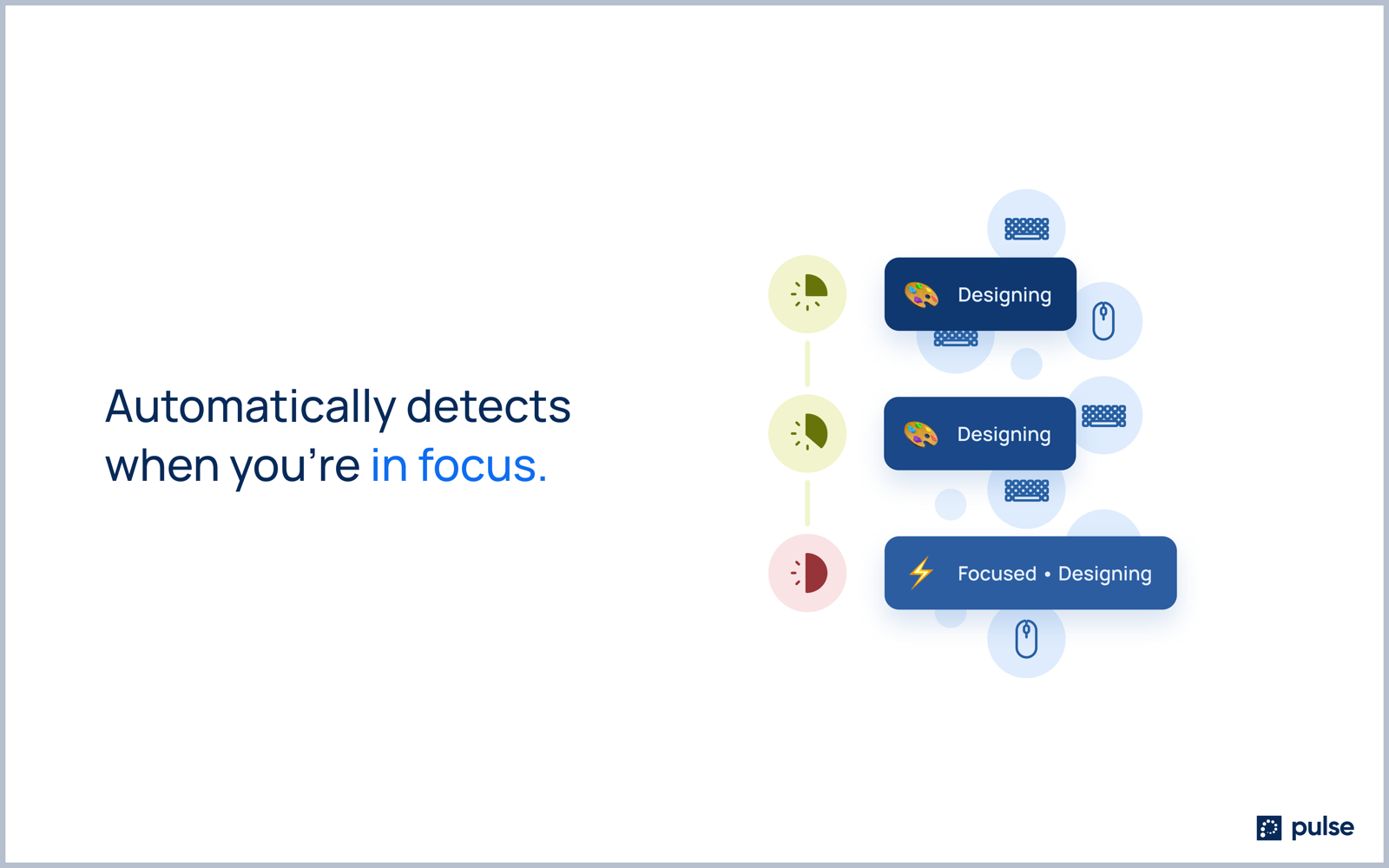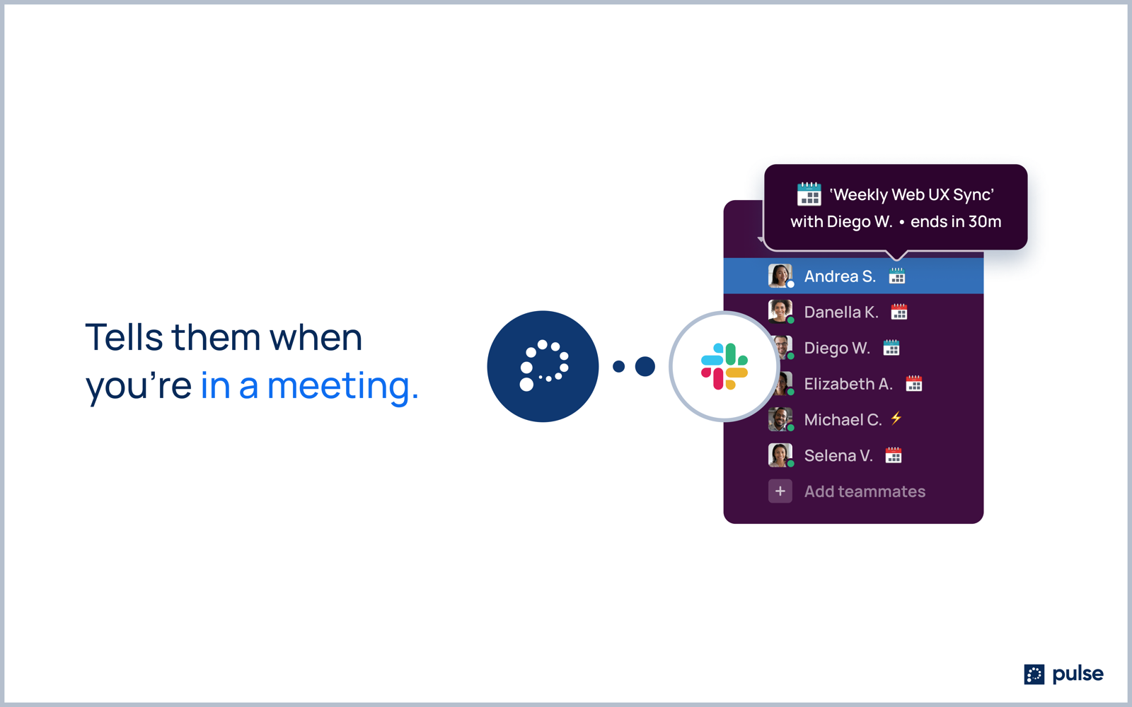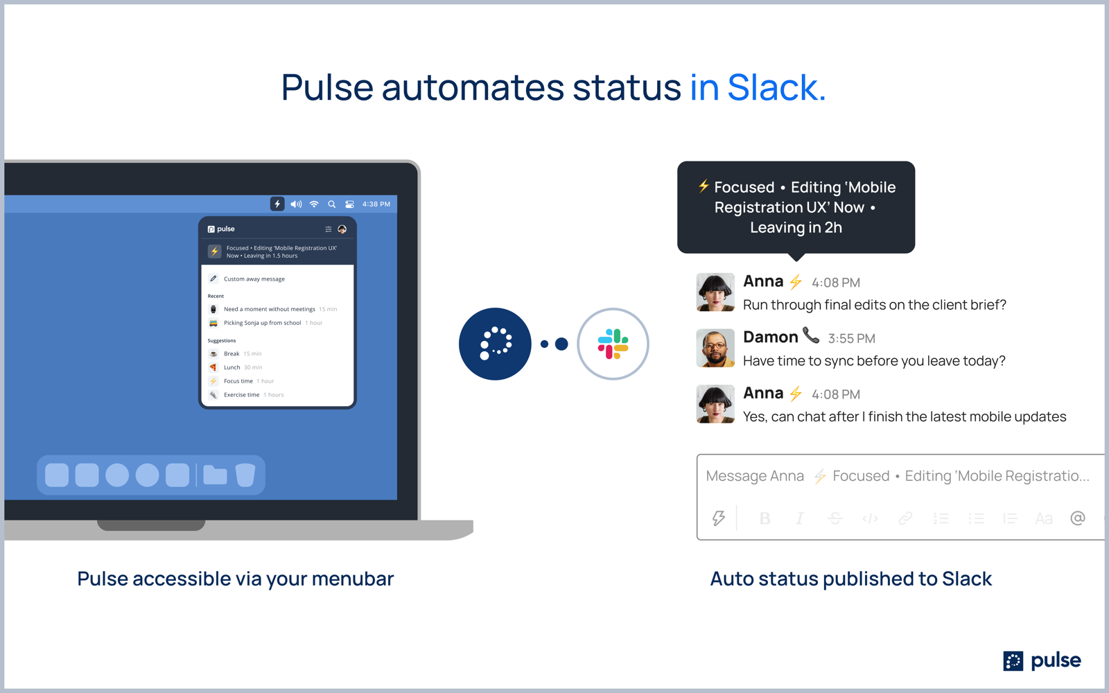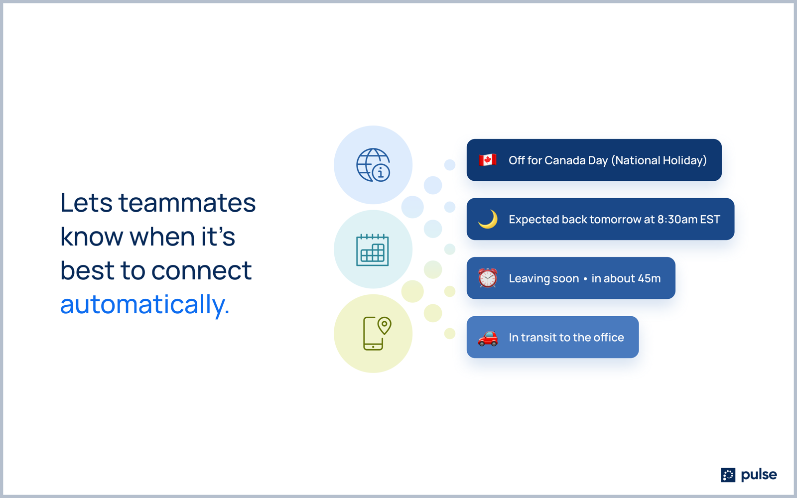Available for download on Windows and Mac devices at the Pulse website: www.getpulse.team. Presence and status have not evolved since ICQ. Skype made some improvements in 2008 with mobile, by making you online from your phone but otherwise, presence and status have remained a green dot. With teams now distributed, remote work challenges are front and center. Teams have reported less ad-hoc collaboration, more loneliness, more distraction, notification fatigue, and more. Pulse makes remote work better. It goes beyond the green dot to signal availability, reduce interruptions, increase collaboration, or however you choose to configure it. In the office, you see and feel presence. Your appearance is your status but while distributed all of that is lost. Automatic status keeps you in control while completely changing the workplace experience. We hope you enjoy Pulse.