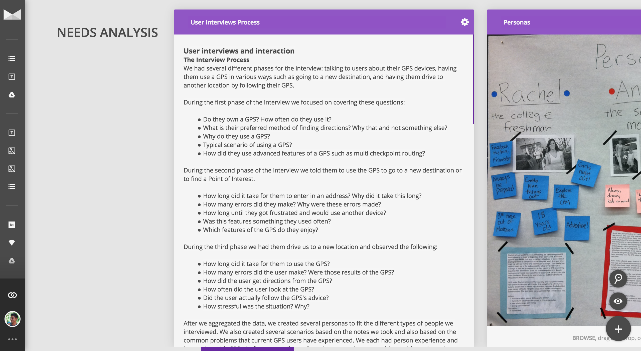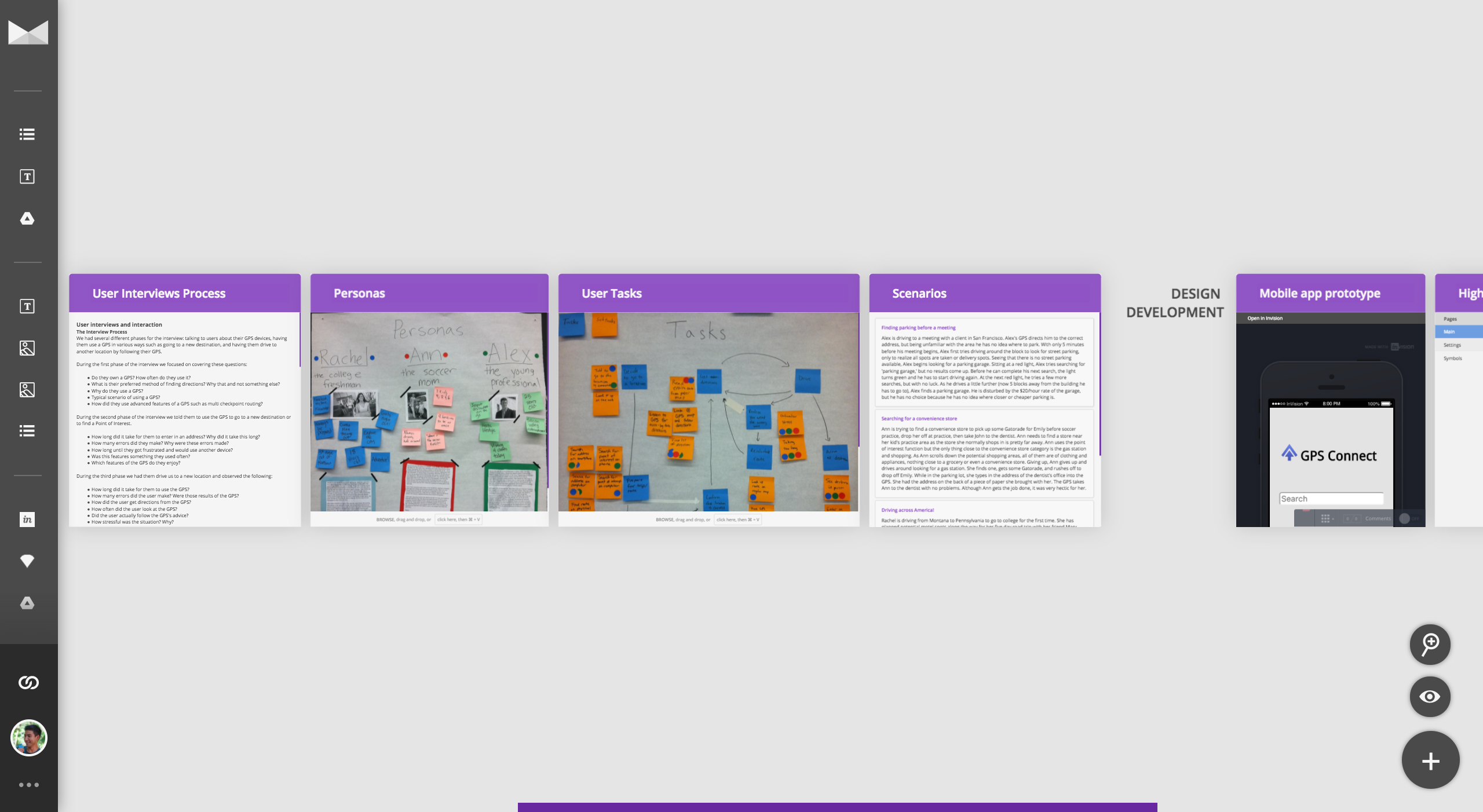 Purple allows you to put all of your design and planning work into one place - whiteboard images, specs, designs, prototypes, to do lists, etc. All of your documents and designs are laid out side by side as if they're posted up on a wall, and you can navigate by scrolling left and right. This makes it much easier for you to keep clients, engineers, and even other designers in the loop and contributing in the right place throughout your project.