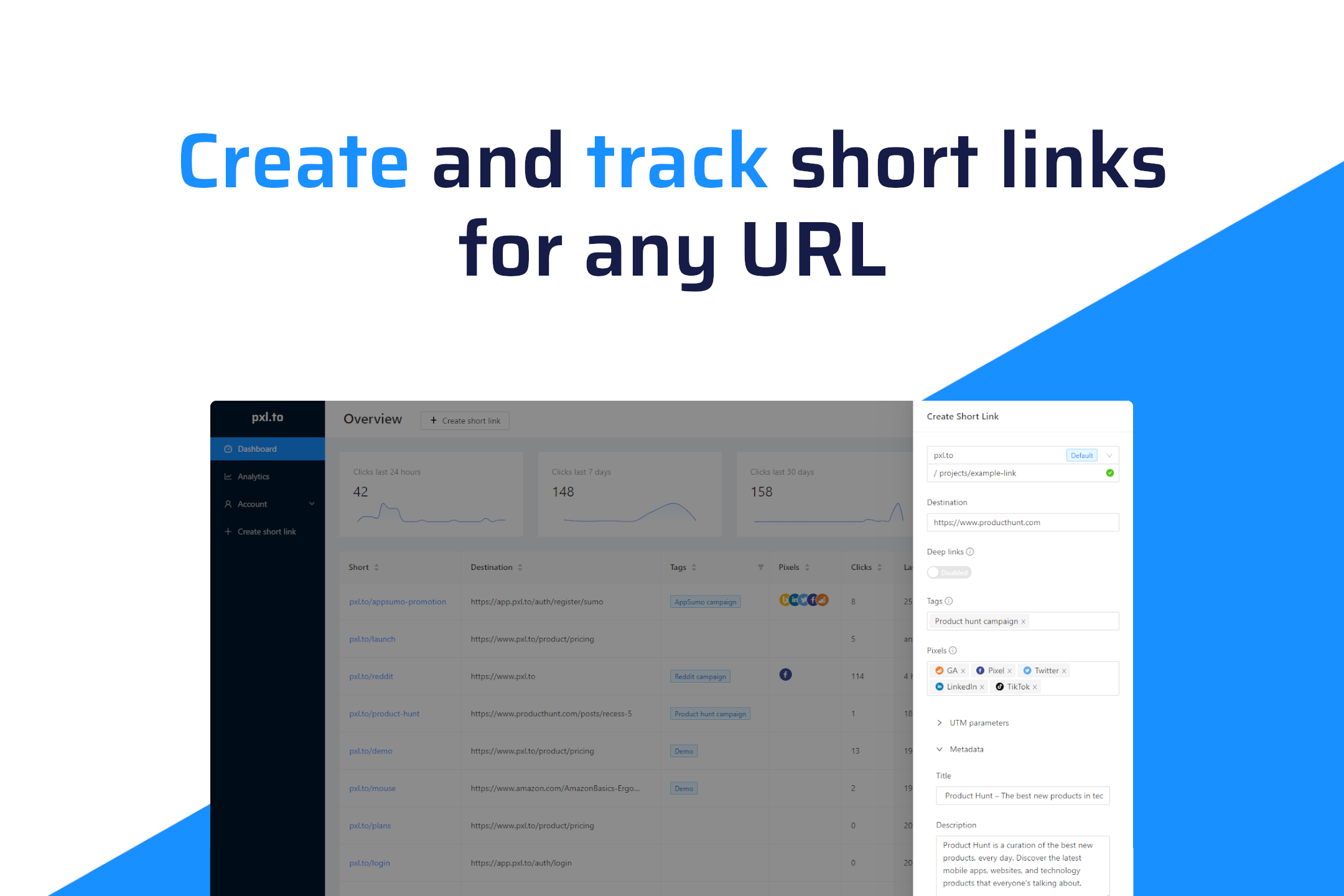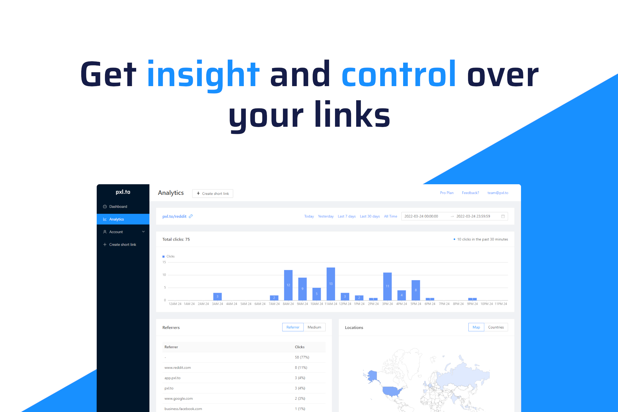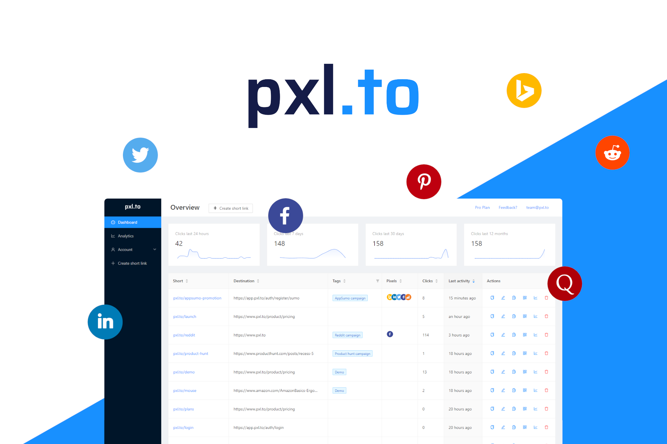 pxl.to allows you to create tiny, shareable links. You can use these to: * Track which channels, countries, devices, platforms are driving the most traffic for your links * Build a retargeting audience and show targeted ads on multiple platforms including Facebook, Google, Reddit and TikTok * Connect your custom domain or use our 5-letter domain, pxl.to! * Generate dynamic QR codes to reach your audience virtually anywhere * Redirect to a different destination at any time