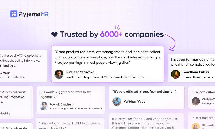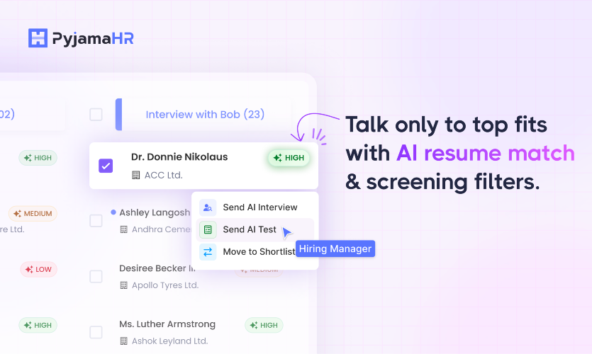 Put your hiring on autopilot with PyjamaHR, the world's first AI applicant tracking system (ATS). Our smart AI agents source and interview 1000s of applicants based on your set criteria in 1-click. Integrated with LinkedIn, Monster, ZipRecruiter and 20 more.