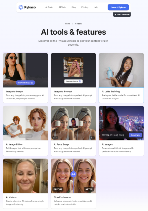 Pykaso is the leading generative AI platform designed to create AI Characters and to help people monetize consistent, ultra-realistic content. Pykaso AI tool’s generate high-quality AI images, videos, and face swaps, all at scale, perfect for social media, brand campaigns, and digital storytelling. Pykaso AI uses advanced AI models such as Flux or SDXL, and custom LoRAs for image and video creation. There is a total of eight tools. The AI Image Generator, Video Generator, LoRa Training, Face Swap, Image Editor, Skin Enhancer, Image to Image and the Image to Prompt.