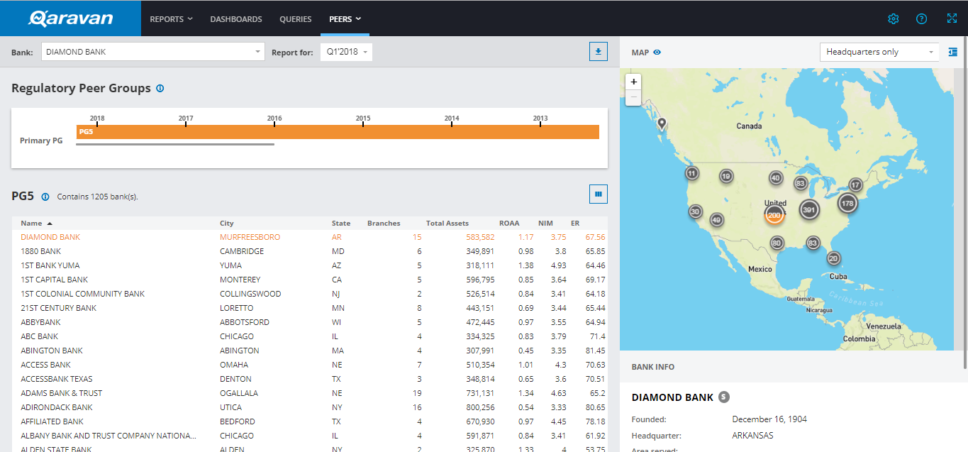The Qaravan analytics platform helps community banks more efficiently and effectively benchmark their risk & performance profiles. Whether preparing for an exam or compiling material for the next board meeting, most bankers spend too much time researching, downloading, and formatting competitor data. Qaravan replaces this tedious process with a suite of software that allows you to shift your focus away from the data and toward the decisions that will drive a more successful strategy. What makes us stand out? CONVENIENT ACCESS: Qaravan's cloud-based solution provides a smarter, more intuitive interface to regulatory data and can be fully configured to remember your preferences. BETTER BENCHMARKING: Easily conduct more relevant peer analysis using Qaravan's powerful Custom Peer Group engine. DATA YOU CARE ABOUT: Pull together the precise information you're interested in--any combination of banks, metrics, and reporting periods--in seconds instead of hours.