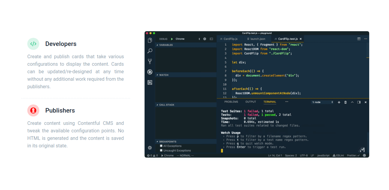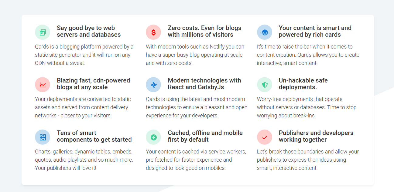 -Say good bye to web servers and databases -Zero costs. Even for blogs with millions of visitors -Your content is smart and powered by rich cards -Blazing fast, cdn-powered blogs at any scale -Modern technologies with React and GatsbyJs -Un-hackable safe deployments. -Tens of smart components to get started -Cached, offline and mobile first by default -Publishers and developers working together
