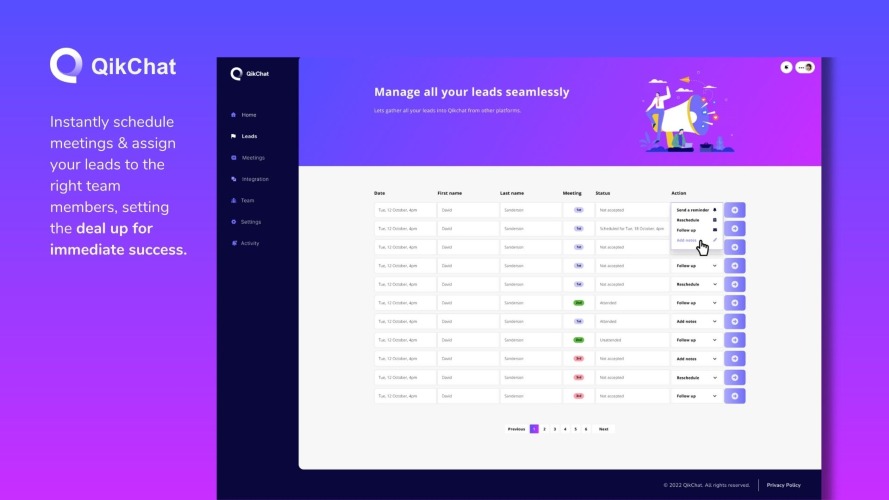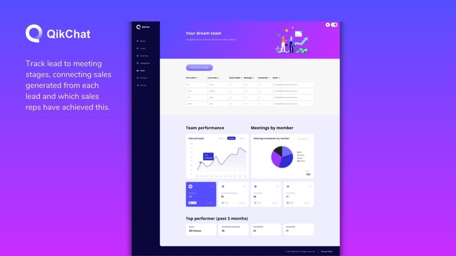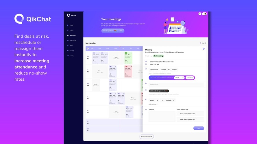 QikChat is a B2B SaaS Scheduling Automation platform, with plans to evolve to a digital SDR. Our platform enables teams to assign, schedule and uncover lead-to-meeting insights that create revenue opportunities to enable teams to close more deals. Real time Meeting data -Know your ideal meeting response time, to ensure high meeting attendance rates. -Understand clearly why your meeting attendance may be falling. -Track scheduled meetings, to know exactly where you deals are going. Leaving no room for error, reaching your sales targets. Schedule Instant scheduling with leads made easy, enable them to place time on your calendar, with 1-click. Turn every lead into an opportunity. -Bypass the massive lead drop-off rate by not taking your leads to separate booking pages. -No more costly back and forth from the sales rep to lead, asking the lead to ‘click the link & select a time.’ -The assigned team members calendar shared with the lead, right after form completion. Assign Right after form completion, route leads from your web forms to the right person. -Assign the right person, successfully moving your leads through your sales stages. -Provide the best lead experience. -Distribute leads evenly throughout your team, setting your team up for success.
