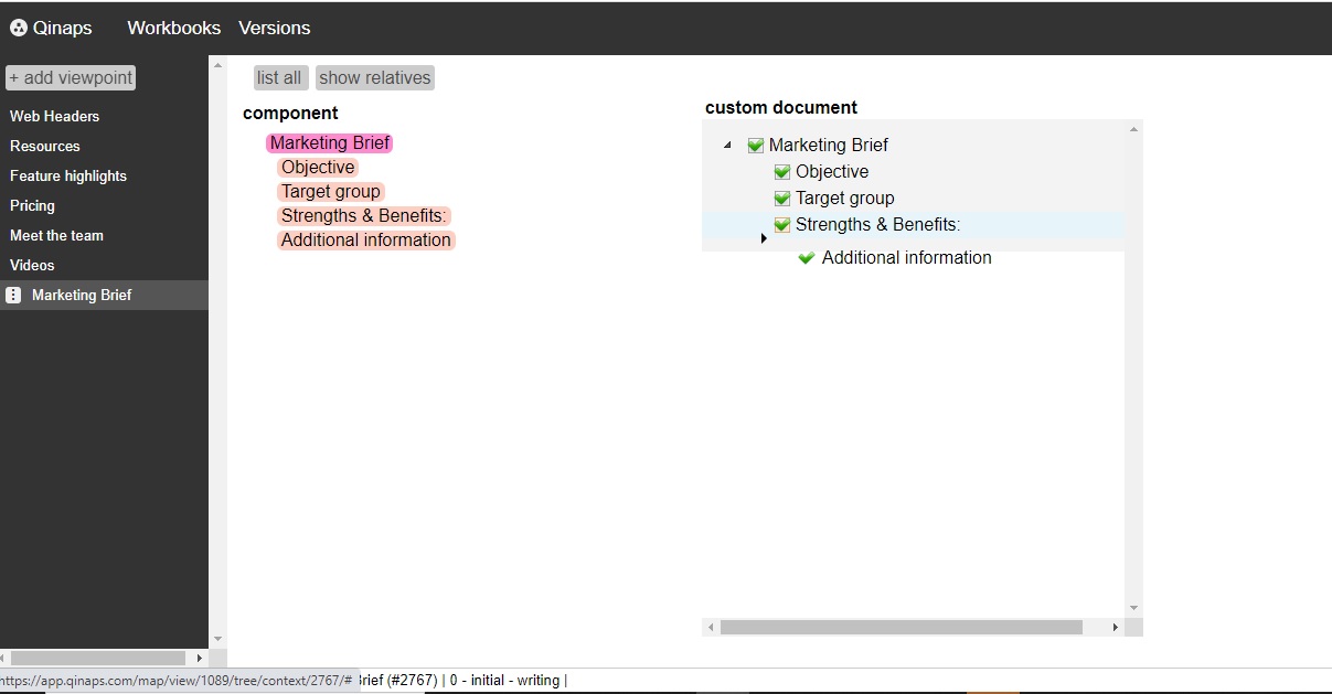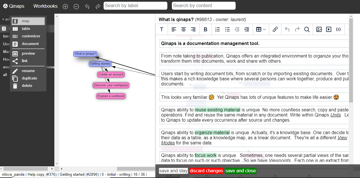 Qinaps is a #collaborative? documentation application for structured and #interlinked? #notes? to produce live #documents?. Sign-up at https://www.qinaps.com? Keep your documents fresh and alive in a breeze. Write once, reuse many times. Tear down existing documents into reusable components. Arrange your knowledge base with your own logic. Build new documents. Share. Publish. And much more. In a nutshell, make countless hours of search/copy/paste/review/distribute a thing of the past. Insert pictures, complete documents, data tables, links, code snippets, and much more! Capture your ideas and notes in components to form an interlinked Map. Fill details into each component and then assemble complete documents using a "Doc Manager" such as an annual Sales Plan, partner onboarding guidelines, handbooks, production plans, scientific research articles, and many more Create viewpoints of your data consisting of similar clusters of data. This helps the user with the flexibility to create data clusters and quickly focus on information within those cluster viewpoints. View components within each viewpoint in visual layout as a Map or as a Document by cherry-picking components, re-arranging and re-using to deliver several documents. Invite and manage several team members and collaborate on a Work-book. Manage several versions of your document and never lose track of your work. Easily share the disappearing document previews via links that expire in 24 hours.