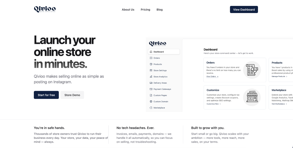Qivioo is a cloud-based e-commerce platform that lets small businesses launch and manage online stores without coding. It handles payments, invoicing, delivery settings, and custom domains while providing a fast dashboard and mobile‑optimized storefronts. Customize themes and pages, automate order emails, and share invoices on WhatsApp. Connect Facebook Pixel, Google Analytics, Mailchimp, and more via the app marketplace. Track sales and behavior with built‑in analytics and manage products, delivery areas, and orders from one place.