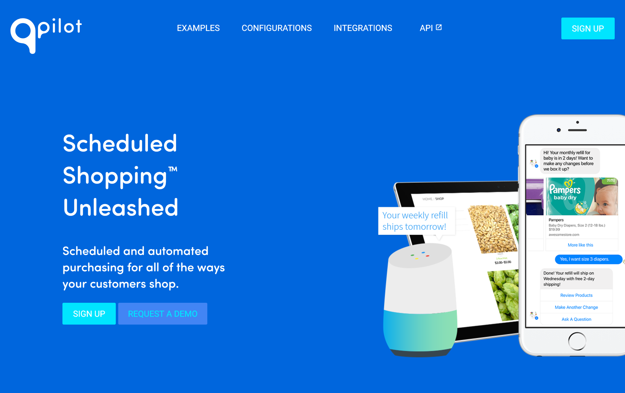 QPilot unleashes Scheduled Shopping experiences like Subscribe and Save or Automated Replenishment to work with any platform and any customer experience. Marketers of consumer goods use our web service and API to quickly and easily activate these programs on their websites, chatbots and connected IoT to enable their customers to create and adjust any aspect of their future recurring orders. Don't just be a monthly box! Put your products on QPilot today and use our API to innovate the customer experiences of tomorrow at https://docs.QPilot.cloud