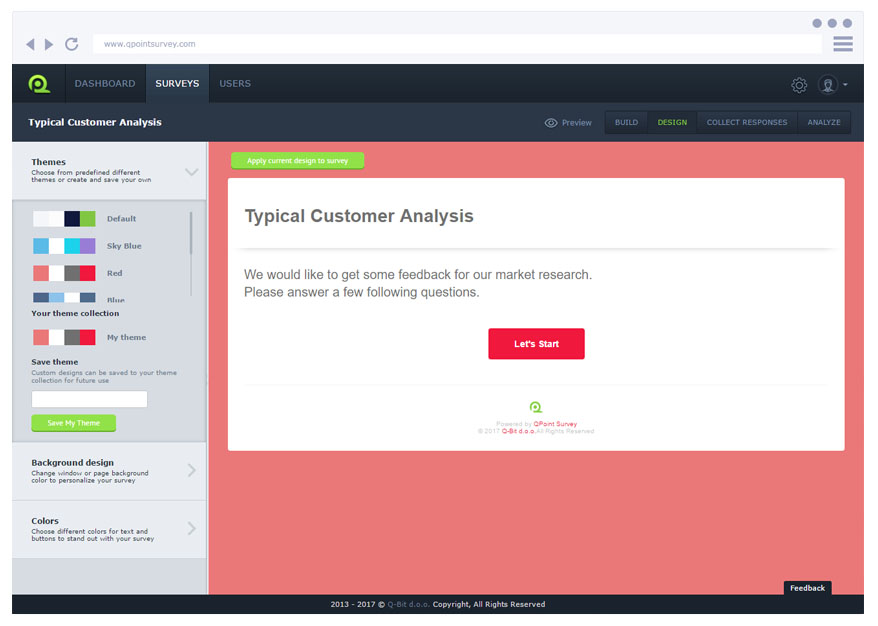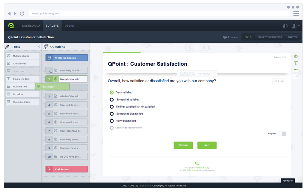 QPoint is a web based software tool for creating online surveys, collecting responses and analyzing data. You can easily use QPoint to reach your customers and get their opinion on your service or product. QPoint can be used for customer surveys, music research, market research, job satisfaction, quizzes and much more.