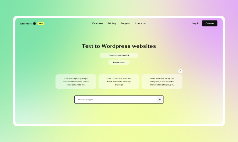 Qtandard is a user-friendly Text-to-Website Builder that turns your words into professional websites using GPT technology and WordPress. It's perfect for anyone who wants to create a personal blog, a portfolio, or a business site without the hassle of traditional web design. With Qtandard, making a website is as simple as writing text. The platform takes care of the design and technical details, so you can focus on sharing your ideas or showcasing your products online. Whether you're starting from scratch or looking to upgrade your online presence, Qtandard makes the process easy and enjoyable.