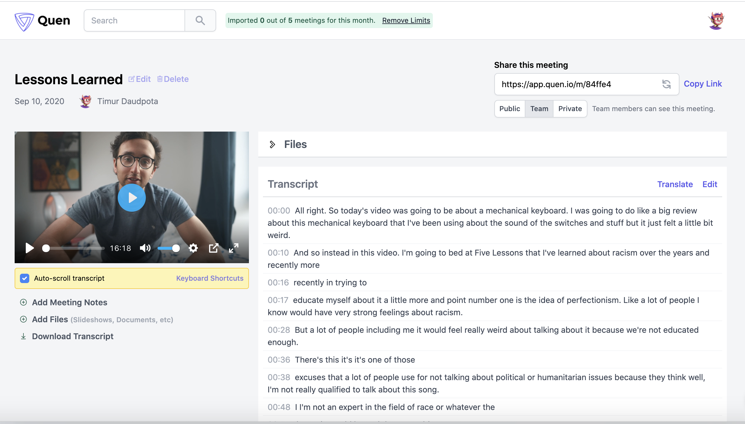Record, Transcribe and Search across your voice & video conversations. Easily Import meeting Recordings Quen works with audio or video recordings of your meetings. Import your Zoom Cloud recordings automatically, or just upload your files. Any audio or video file welcome If you've got an audio or video file of your meeting recordings through any platform like Google Meet, you can also import them into Quen for easy access. Transcribe and Translate Transcribe in your native language, if you are having meetings Korean, Spanish, French or German. You can even translates your meetings.