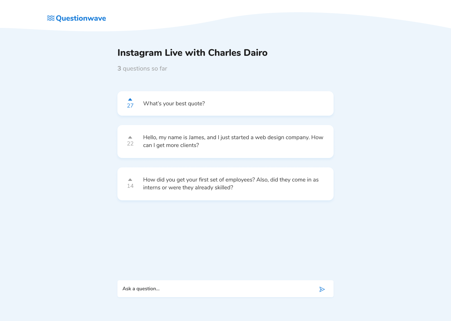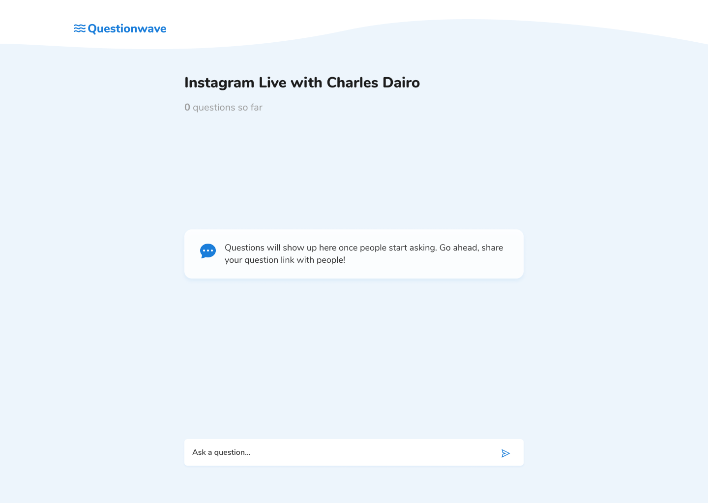 We built Questionwave to make the Q&A sessions at events faster and more organized. Questionwave helps event hosts to collect questions ahead, or during an event. 100% free, super-fast, and no registration required.