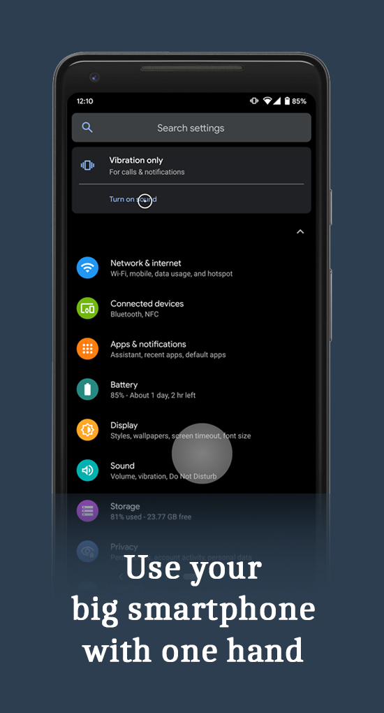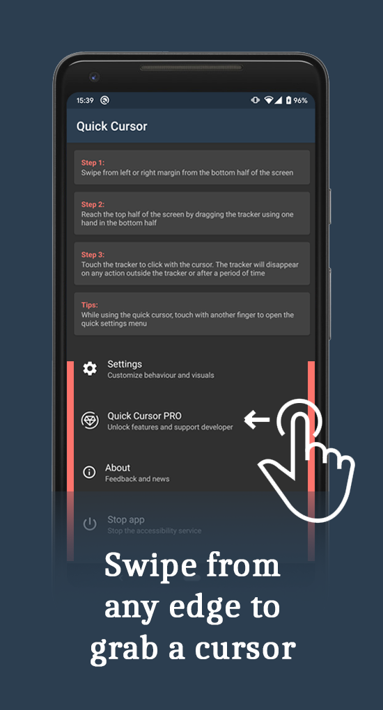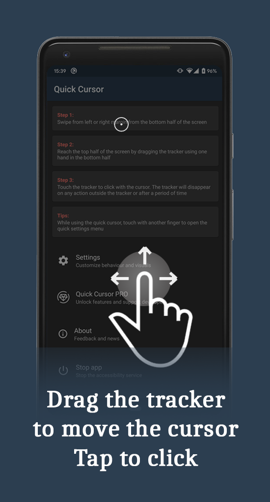 Helps you to use big screens easily with one hand by introducing a computer like cursor controlled with one finger by swiping from edge of the screen. Easy to use: 1. Swipe from left or right margin from the bottom half of the screen. 2. Reach the top half of the screen by dragging the tracker using one hand in the bottom half. 3. Touch the tracker to click with the cursor. The tracker will disappear on any action outside the tracker or after a period of time.