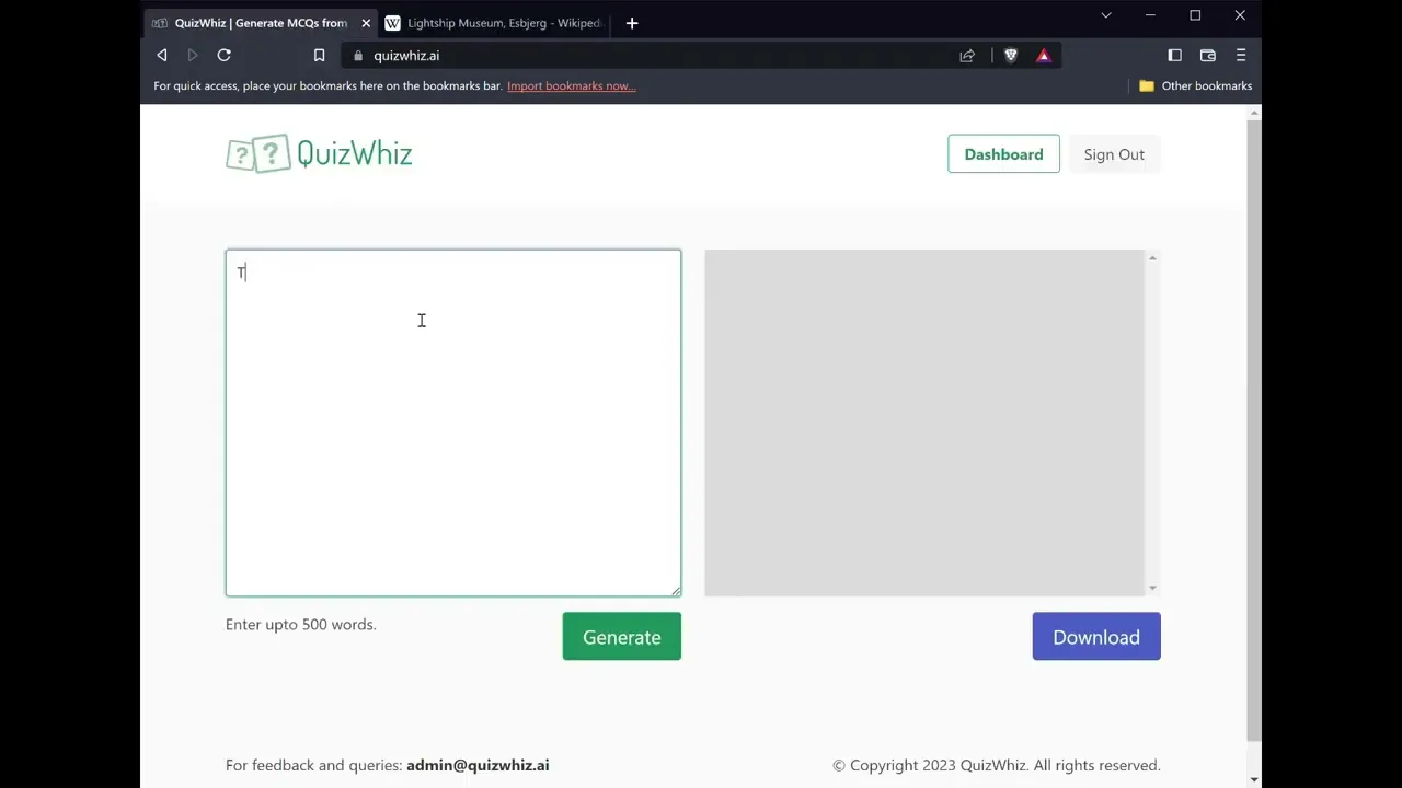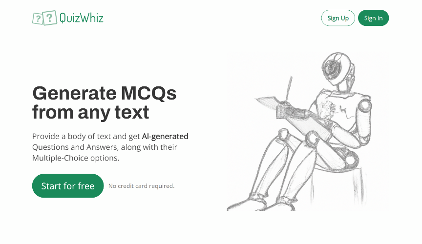 QuizWhiz uses the latest Artificial Intelligence technology to generates multiple-choice questions and answers from any given text. It accepts text as either Text input or as a Pdf file upload, and then generate the MCQs that the user can download. There is a free plan that allows upto 20 free "runs" and the paid plans start with $9/month that allow upto 1000 runs.