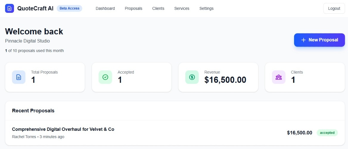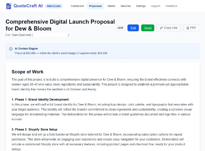 QuoteCraft AI is a proposal generator built for freelancers, consultants, and small agencies. Describe your project — type it or use voice input — and the AI creates a complete, branded proposal with scope of work, deliverables, timeline, and pricing. Features: - Context Engine learns from your accepted and declined proposals to improve pricing and language over time - Interactive proposals let clients toggle line items on or off, with the price updating in real time - E-signatures with IP address and timestamp - Branded email delivery with view tracking so you know when clients open your proposal - Smart follow-ups automatically remind clients after 3, 5, and 7 days - Voice input — describe your project out loud instead of typing Built for freelancers who are tired of spending 30+ minutes per proposal in Google Docs. Free during beta with full access to all features.
