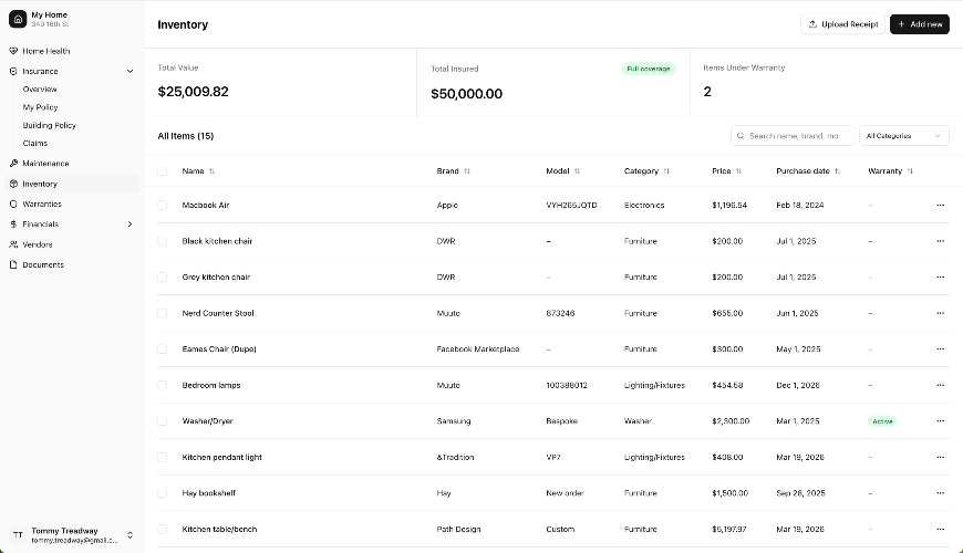 Rafter gives homeowners a single, intelligent view of their home. It scores home health by system, flags urgent risks, and updates as you resolve issues. It analyzes insurance policies to surface coverage gaps and recommendations before a claim. Upload receipts or warranties and it auto-extracts details, links them to the right appliance, and keeps documents organized. Stay ahead with maintenance reminders tailored to your home's age and history, and track appreciation, investments, and net return with multi-source valuations.