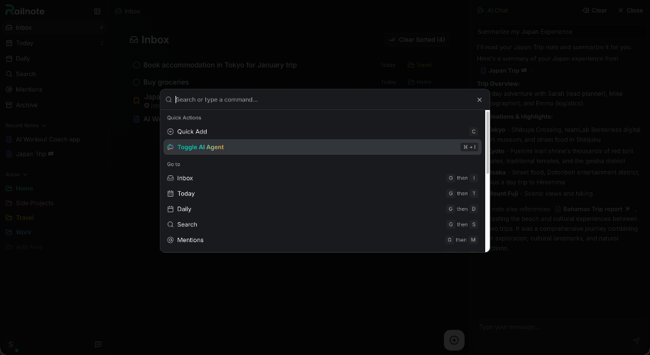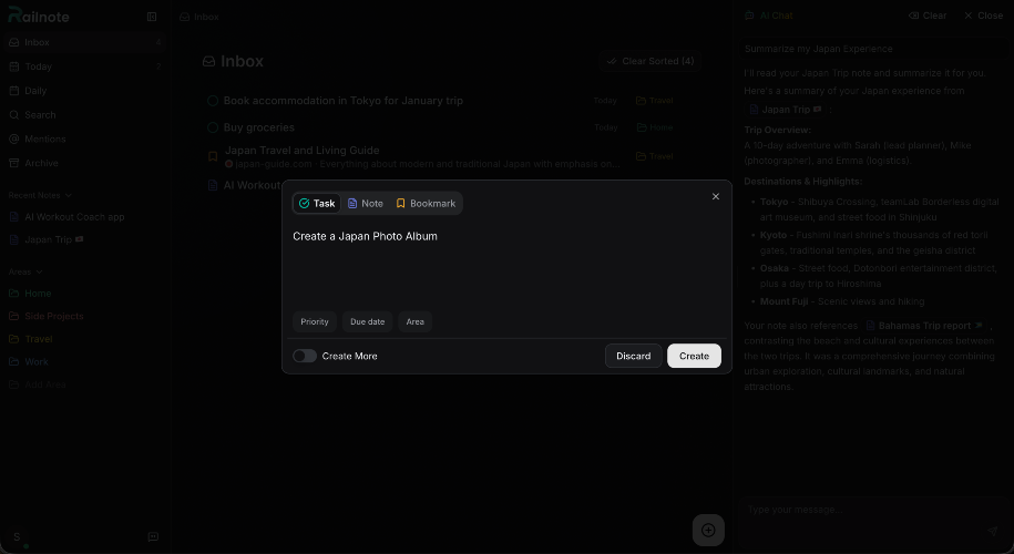 Railnote puts your tasks, notes, bookmarks and habits in one clean feed. Capture anything instantly with Quick Capture. Focus on what matters with Today View. AI helps you write, search and organize your content. Simple enough to use daily, capable enough to replace four apps.