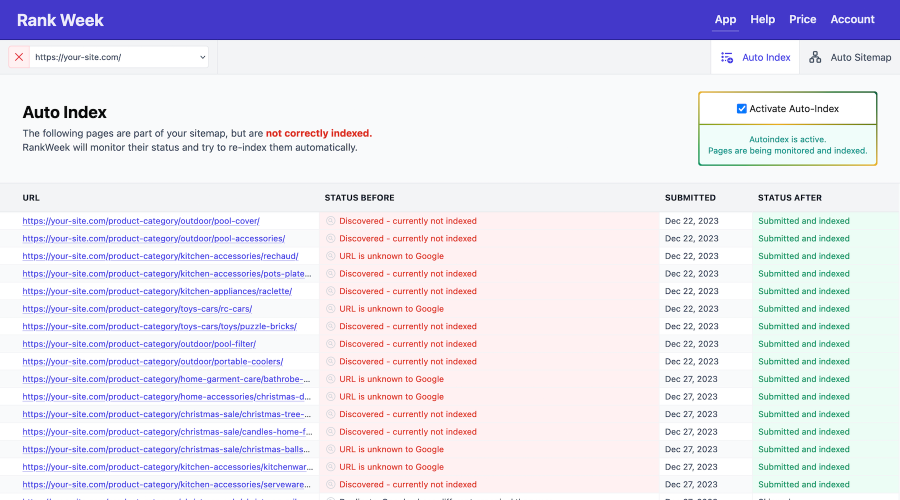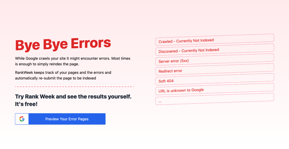 While Google crawls your site it might encounter errors. Most times is enough to simply reindex the page. RankWeek keeps track of your pages and the errors and automatically re-submit the page to be indexed