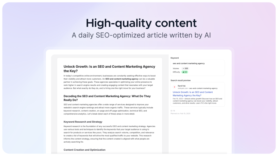 RankYak is revolutionizing SEO content marketing with its AI-driven automation platform. Designed for businesses and marketers seeking efficiency and scalability, RankYak simplifies the complex tasks involved in SEO strategy — keyword research, content planning, writing, and publishing — into a seamless, automated process. Here’s how RankYak works: Keyword Research: The platform analyzes your website, audience, and industry to identify low-competition, high-potential keywords that can drive traffic. Content Planning: Based on these keywords, RankYak generates a dynamic monthly content plan tailored to your goals. Daily Article Creation: Every day, RankYak produces unique, SEO-optimized articles aligned with the content plan. These articles are designed to improve rankings and attract organic traffic. Automated Publishing: The platform integrates directly with popular CMS platforms like WordPress, Webflow, Shopify, Zapier, and Make, ensuring that fresh content is published daily without manual intervention. RankYak’s automation ensures consistency — a crucial factor for improving search engine rankings — while freeing users from time-consuming tasks. Whether you’re an entrepreneur managing a lean operation or part of an agency handling multiple clients, RankYak offers tools to streamline workflows. Agencies can even manage multiple accounts under one dashboard and enjoy tailored plans. With a subscription model priced at $99/ month, RankYak provides continuous updates and integration capabilities via API and webhooks. While its high degree of automation may require minor adjustments to align perfectly with brand voice, it remains an invaluable resource for scaling SEO efforts efficiently. For those ready to transform their content strategy, RankYak promises simplicity and results — generate your first article within minutes and watch your traffic grow effortlessly.
