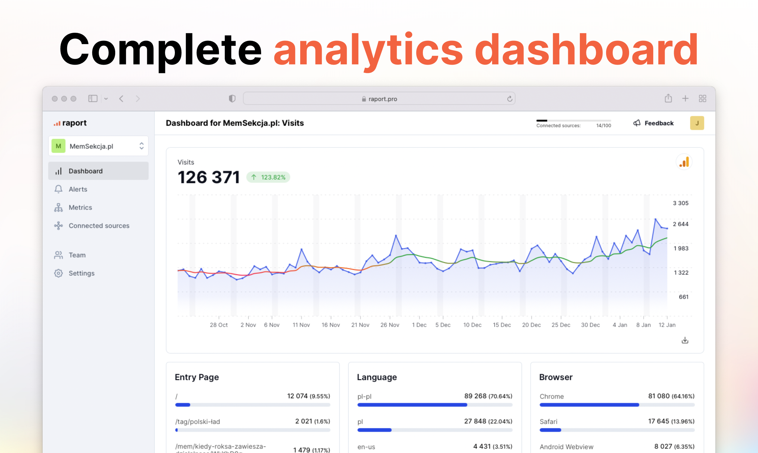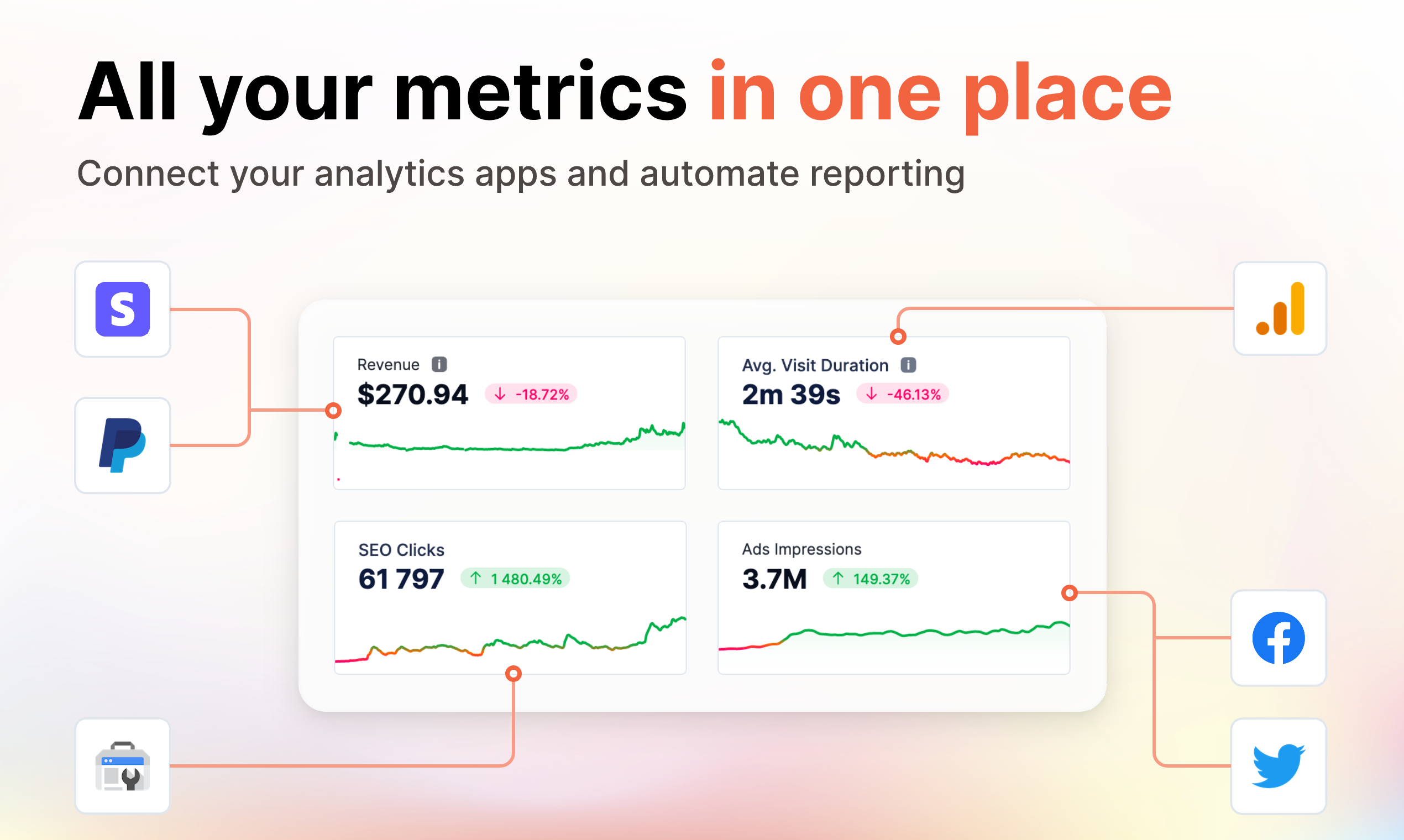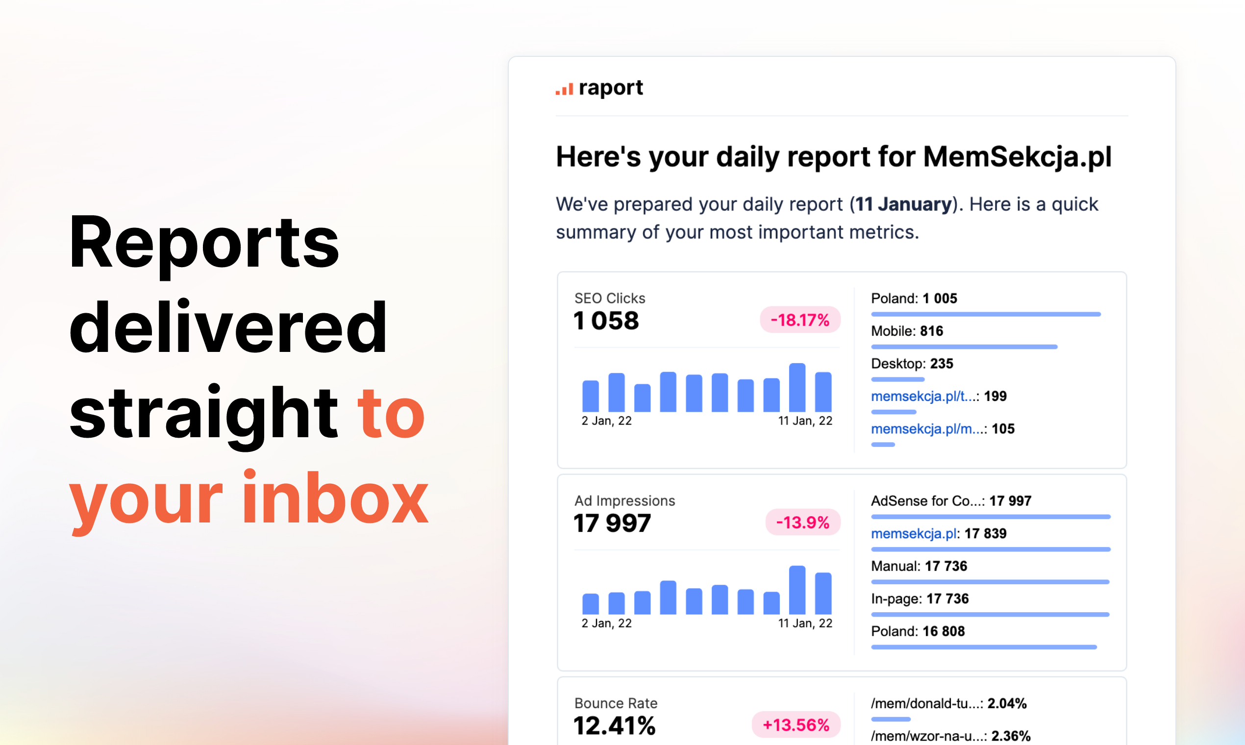 Raport is an all-in-one analytics tool. It allows you to integrate data from multiple sources (eg. Google Analytics, Search Console, MongoDB). Data is then aggregated by metric and displayed in one, clear dashboard. You and your team can receive daily, weekly and monthly performance reports via email. You don't have to build them from scratch or even use any pre-made templates. Each report you receive is generated automatically and contains metrics most important to your project.